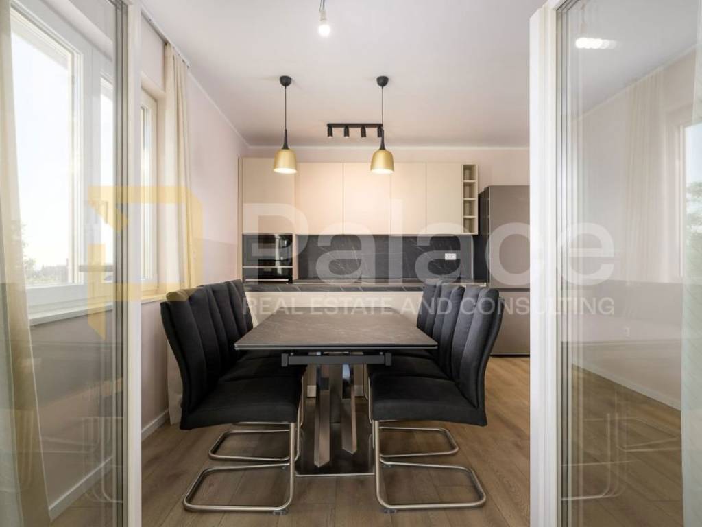 The apartment consists of three spacious rooms and three excellently equipped bathrooms, providing complete privacy and ease of daily living. The open concept of the living room, kitchen, and dining area creates an airy, connected space filled with natural light throughout the day. The living area leads to a beautiful 12 m² balcony – a perfect spot for morning coffee, relaxation, or socializing while enjoying the view of the peaceful neighborhood.