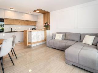 The interior of the apartment includes a spacious open-space concept that connects the kitchen, dining room and living room, with access to a covered terrace of 15 m2 with a view of the sea and the surrounding landscape.