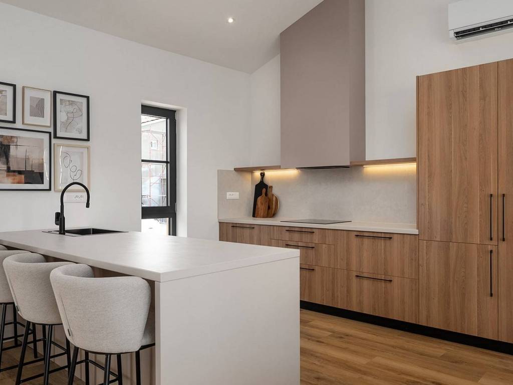 The spacious open-plan living area unites the living room, kitchen and dining room, offering a sense of comfort, airiness and functionality.