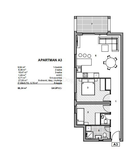 The net living area is 60.64 m, while the gross area including the loggia is 68.24 m.