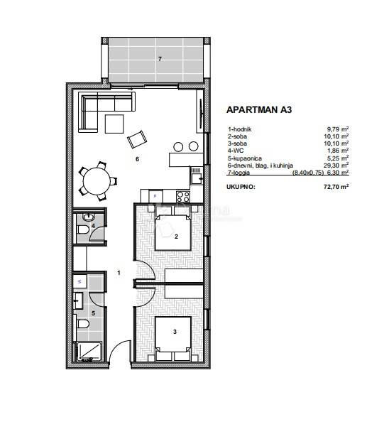 The apartment consists of: a hallway, two bedrooms, one bathroom, one WC, a kitchen, dining room and living room with access to a loggia (8.40 m) (floor plan attached in the listing).
