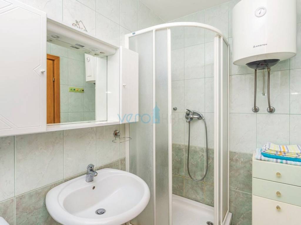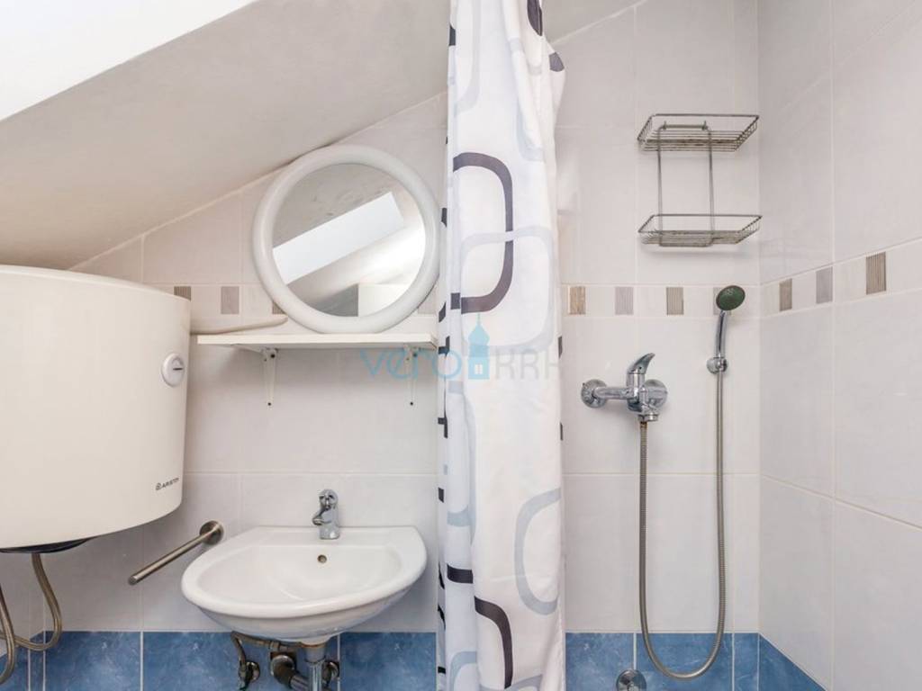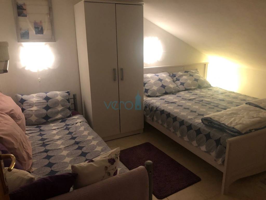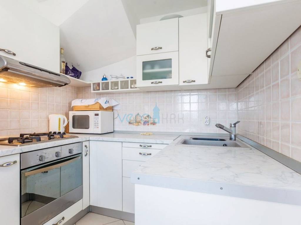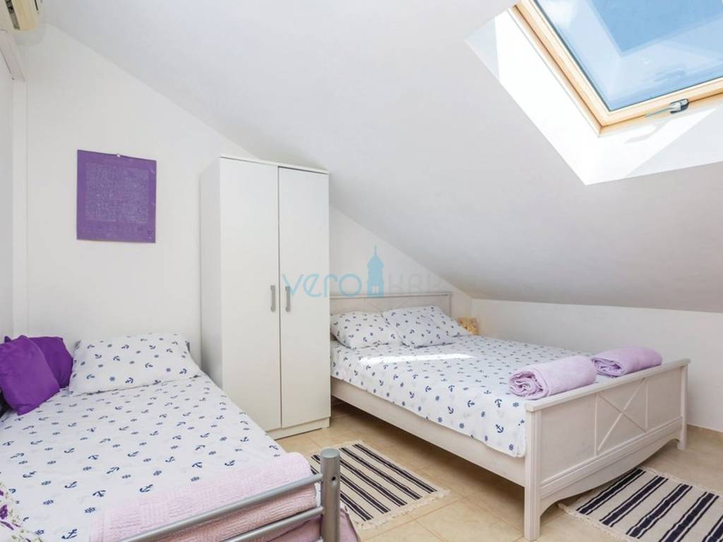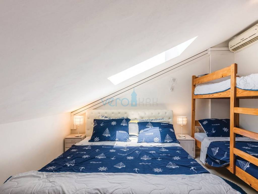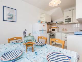 Čižići, in an airy location, offers a beautiful two-story apartment of 83 m². On the first floor, there is a hallway, one bedroom, a bathroom, a living room with a dining area, a custom kitchen, a storage room, and a covered terrace of 5 m². Interior stairs lead to the high attic, where there are two more bedrooms, a bathroom, and a hallway. The roof is sloped, concrete, and well insulated.