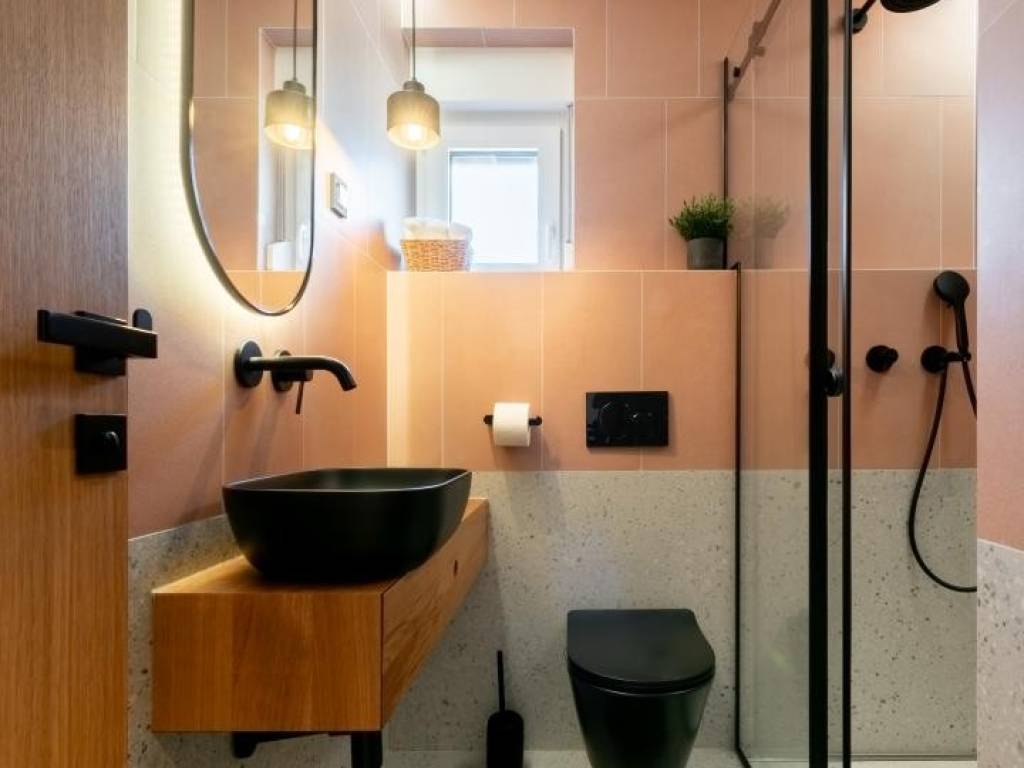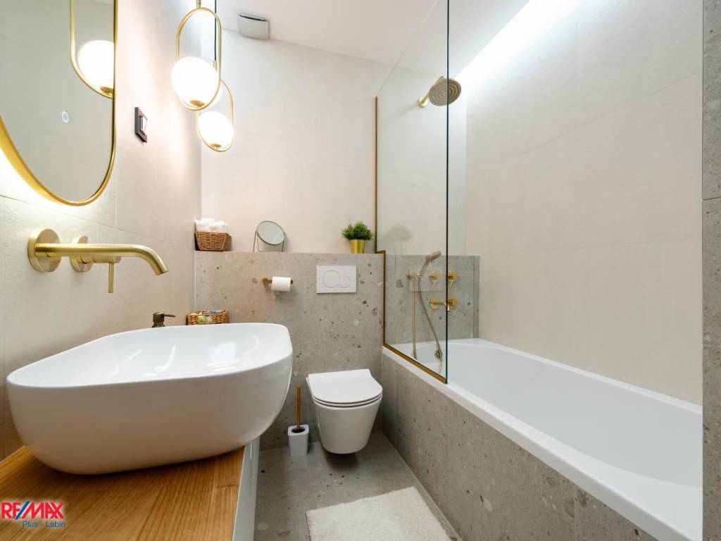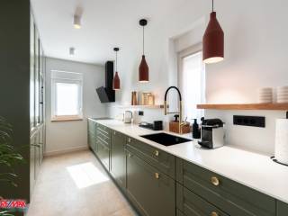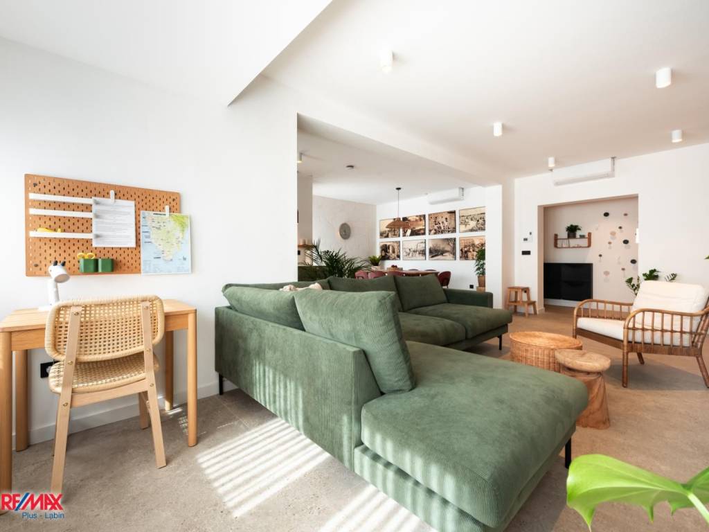 The apartment consists of an entrance hall, living room, dining area and kitchen with access to the yard, three bedrooms and two bathrooms. It was completely renovated in 2023 and furnished with custom-made furniture.