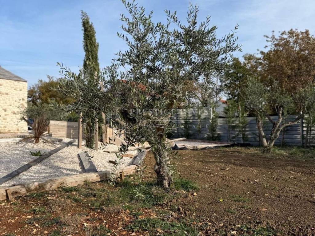 The environment is fully landscaped: Rustikkamen concrete slabs Travertino 40×60 in beige — the look of old Istrian stone.