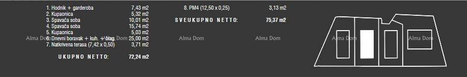 New on the market!In the beautiful town of Fažana, we offer modern apartments in a new construction with a communal pool, located within an attractive project consisting of four buildings with a total of 23 apartments of various sizes and layouts. The project is situated in an excellent location – a peaceful environment near the sea and all essential amenities.Apartment B3 is located on the first floor of a building with three stories. The apartment consists of a hallway with a wardrobe, a living room with a kitchen and dining area, 2 bedrooms, 2 bathrooms, a wardrobe, and a covered terrace.Equipment and standards:- Underfloor heating in bathrooms.- High-quality ceramic tiles.- PVC French-style windows with blinds and insect screens.- Bathroom fixtures from renowned manufacturers.- Air conditioning unit.- Anti-burglary entrance door.- Option to choose the flooring – ceramics, parquet, or laminate in the bedrooms.1 parking space included in the price.Each building will have its own secured vehicle access via a remote-controlled gate. The rear part of the building, including the parking area, will be monitored by video surveillance 24/7, ensuring maximum privacy regarding entry and exit, as well as the security of vehicles in the parking lot.The pool measures 5.70m x 14.90m, or 85m2, making it the largest pool in the residential complex in the area. Along the entire length of the pool, there will be a sunbathing area with loungers and lounge furniture. Additionally, there is a plan for a "house" by the pool, which will be of a modular type, designed with a summer kitchen, barbecue, and a large dining table for communal gatherings. The pool, as well as all equipment and facilities, will be exclusively for residents" use.The planned start of construction is March 2026, with completion scheduled for September 2027.We are accepting reservations.For more information, please contact:Azra:+385 91 611 5706+385 98 420 885azra@almadominvest.com