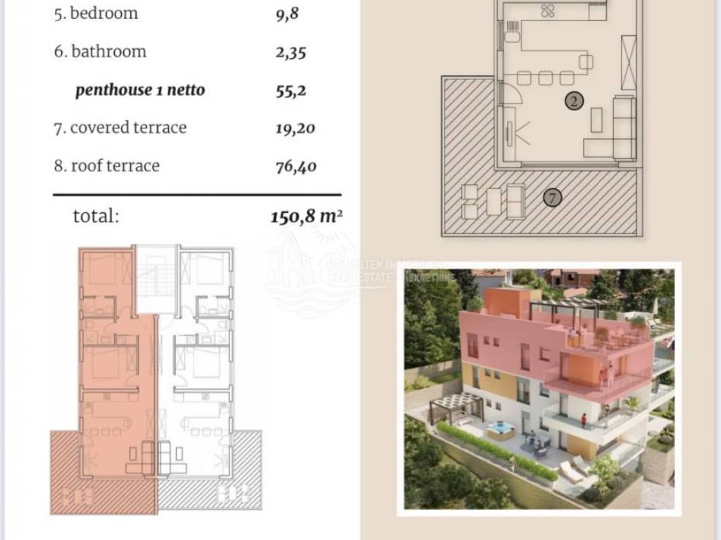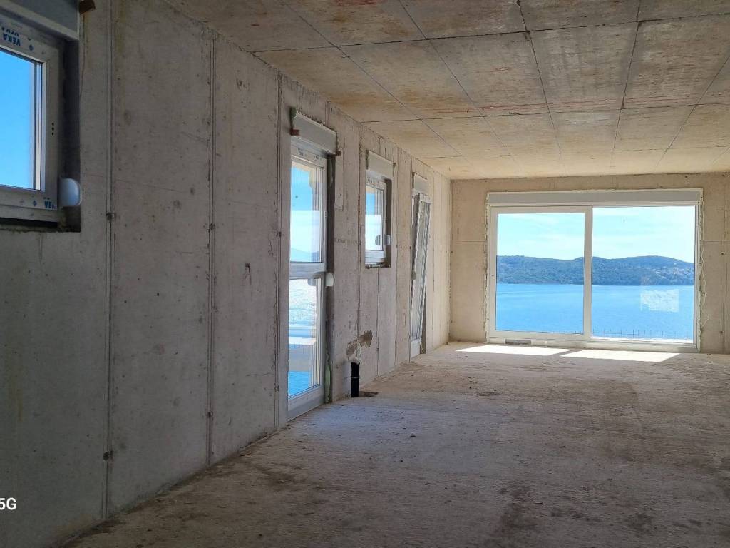 UNIQUE OPPORTUNITY! We are mediating the sale of an apartment located on the second floor of a newly built building consisting of 6 residential units. This building is located in an excellent location, close to all tourist facilities and 150 seas away. Apartment S5 has a total living area of 85 m2 with a terrace coefficient, and consists of a living room, kitchen and dining room, two bedrooms, bathroom and hallway. From the living room there is a terrace of 19.20 m2 with a beautiful view of the sea. The apartment also has a roof terrace of 76.40 m2 and two garage parking spaces. The building is built according to the latest construction standards, the apartments will be air-conditioned, and the bathrooms will have underfloor heating.