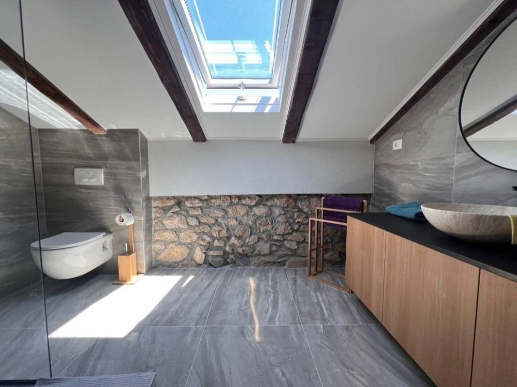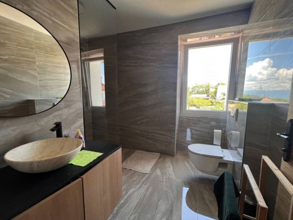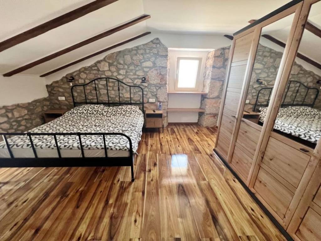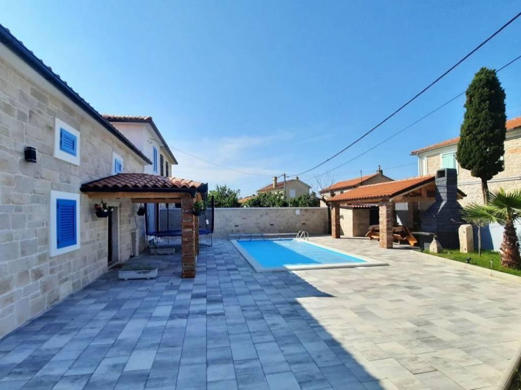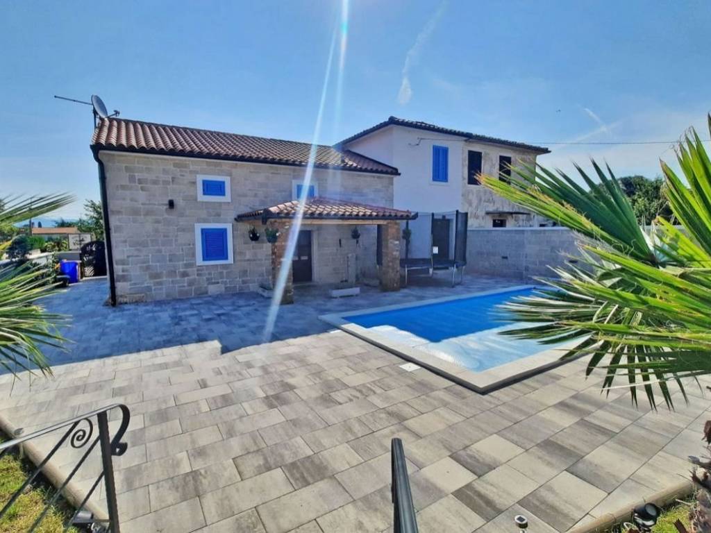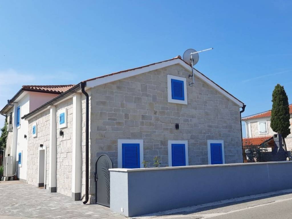 Otok Krk, Malinska, šire područje, prodaja nove dvojne kamene kuće površine 150 m2, s bazenom i uređenom okućnicom površine 276 m2, na mirnoj lokaciji! Kuća se sastoji od prizemlja s ulaznim prostorom, dnevnom sobom, kuhinjom, blagovaonom, stubištem, kupaonicom, vešerajem i spremištem te prvog kata s tri spavaće sobe, dvije kupaonice, toaletom, hodnikom i stubištem. Visoka kvaliteta gradnje i opreme, klimatizacija, dva parkirna mjesta. Udaljenost od plaže i centra Malinske 3000 m.