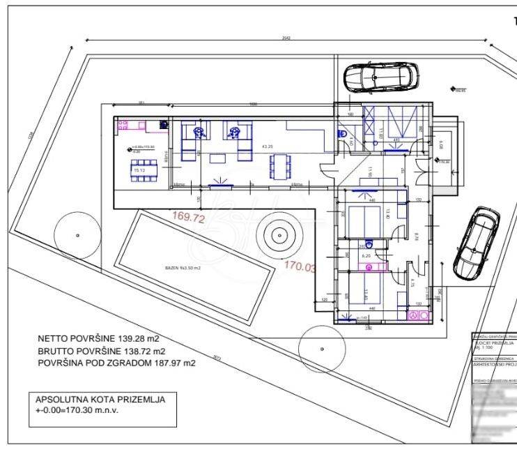 The house is situated on a 549 m² plot, with a net living area of 139.28 m². It consists of three bedrooms, two bathrooms, and an open-plan kitchen and living room.
