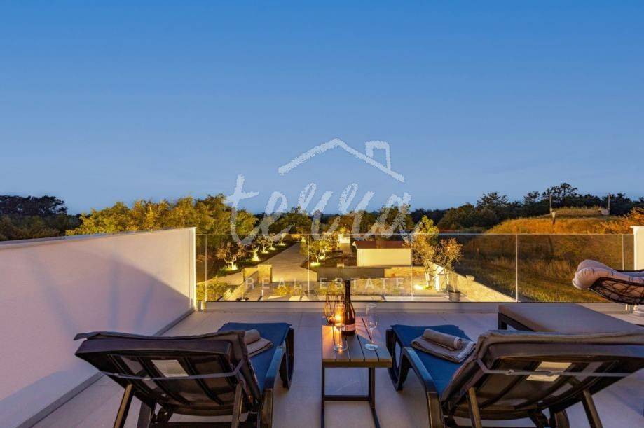Since it is a new building, the house is in excellent condition and regularly maintained. The villa has a net area of 106 square meters, the upper terrace has 32, and the covered lower terrace has 20 square meters, next to which there is a sunbathing area with a swimming pool of 30 square meters. The house is located on a plot of land of 890 m2, surrounded by hedges and olive trees. The yard is illuminated and has a