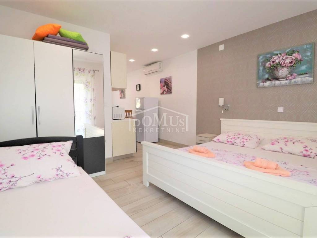 Attractive location, distance 230m from Lovetovo beach. Studio apartment on the ground floor, south side, with a total usable area of 36.50 m2, which consists of a kitchen with a dining room and a living room, as well as a bedroom as a whole, a bathroom, a terrace of 4.96 m2 and a garden of 15.66 m2. The apartment is fully furnished, it is included in the price of the property. The apartment has a garage of 31.03 m2, which is not furnished, but with electricity and water installations, and one parking space in front of the garage. The apartment is 1500m from the city center.