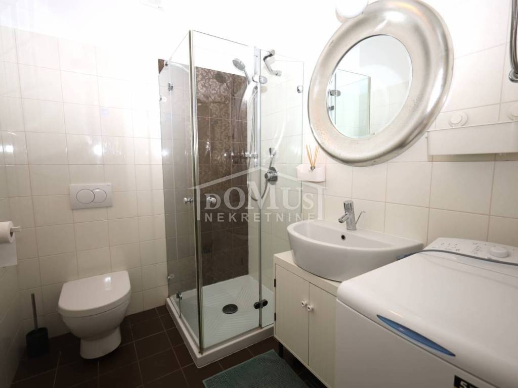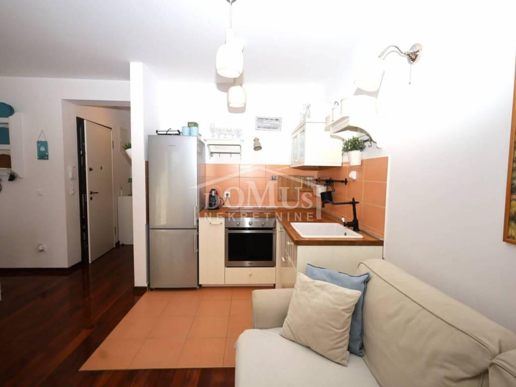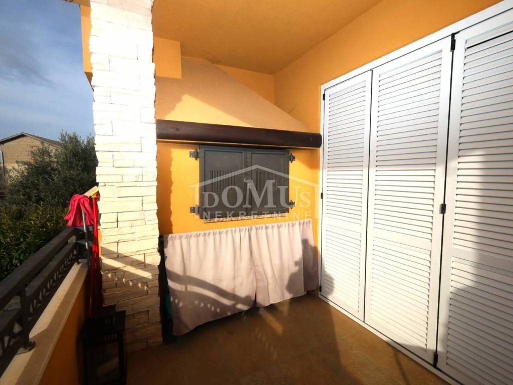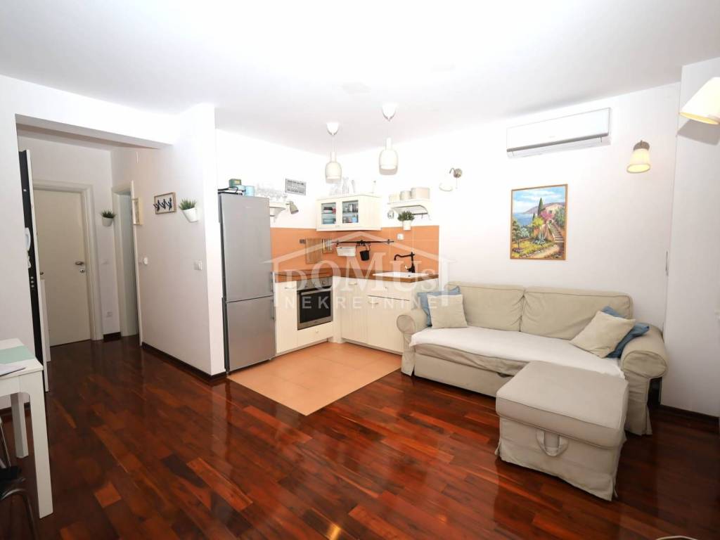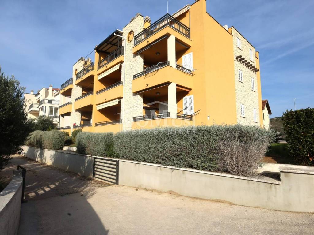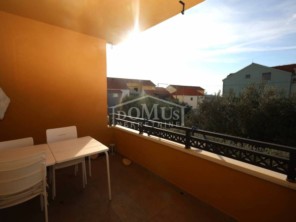 Tribunj, a comfortable one-bedroom apartment with a usable area of 48.49 m², is located on the elevated ground floor of a residential building with a total of six units. The apartment consists of an entrance hall, one bedroom, a bathroom equipped with underfloor heating, a kitchen, and a living room with access to a 10 m² loggia that features a built-in barbecue fireplace. BThe apartment has security doors and wall heaters, is fully furnished, air-conditioned, and ready for immediate occupancy.