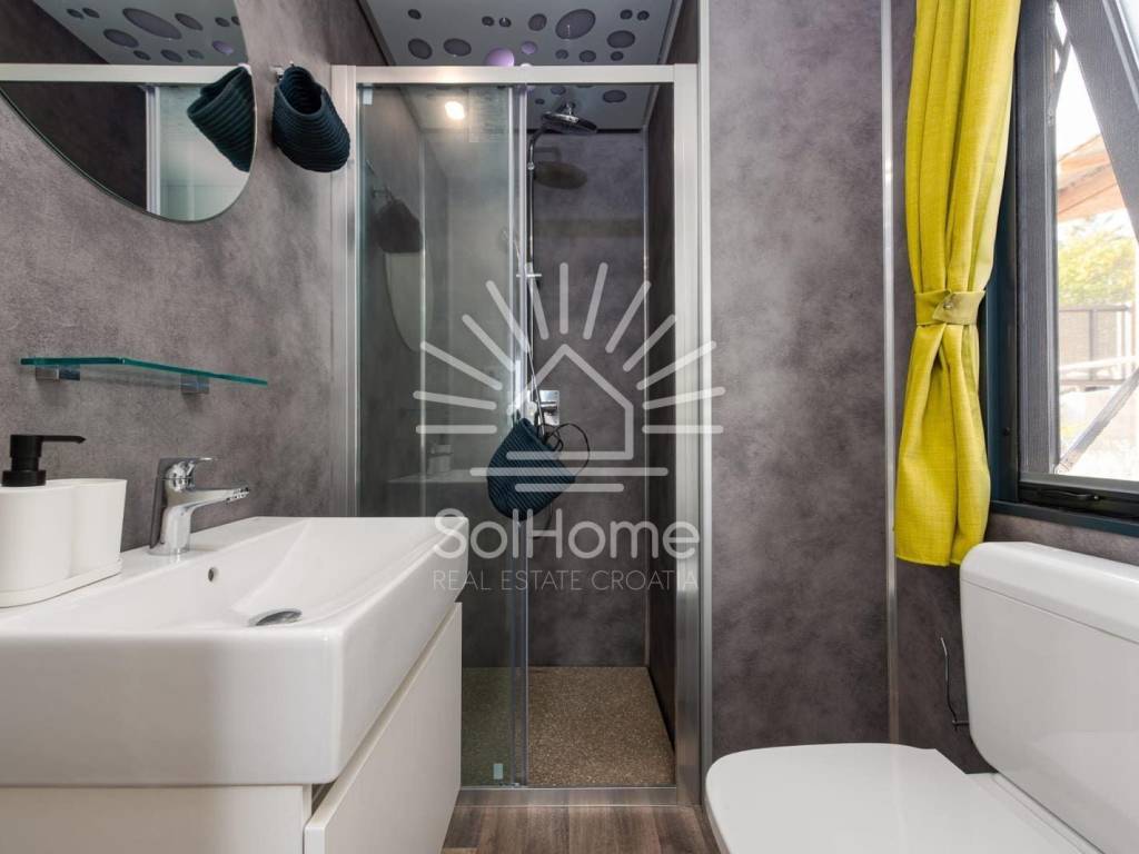 For sale is an impressive property in the Zadar region, covering an area of 163 m², located in an exceptional seafront location. The estate stretches across 518 m² and features a magnificent infinity swimming pool and a spacious garden.