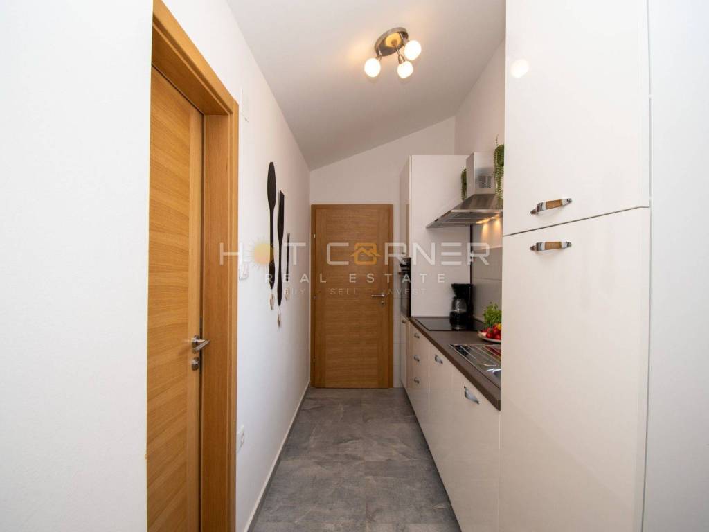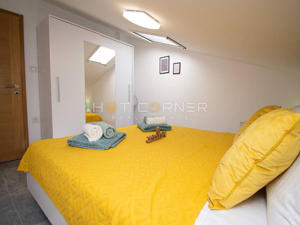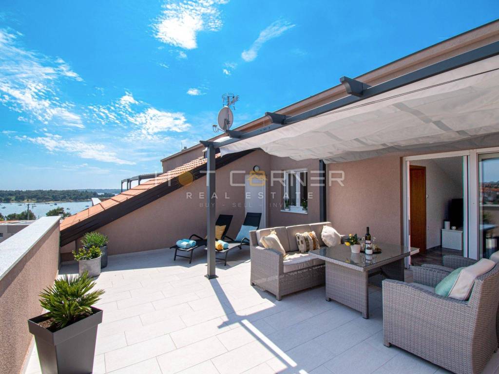 For sale, a modernly decorated and fully furnished apartment in a new building in the settlement of Mukalba, Medulin, surface area 65m2. The apartment is located in the attic of the building and consists of a living room with a fully equipped kitchen, a bedroom, a bathroom and a large terrace (40m2) with an enchanting view of the sea, providing a perfect place for rest and relaxation.