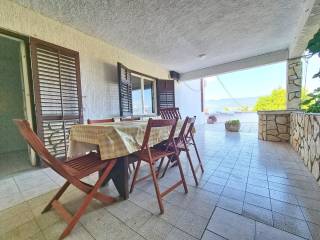 Upstairs, there is a spacious apartment of 100 square meters featuring a living room, kitchen with dining area, three bedrooms, two bathrooms, and a large terrace of approximately 100 m² offering a stunning sea view. The upper floor is accessed via an external staircase.