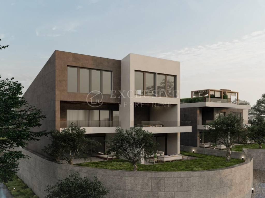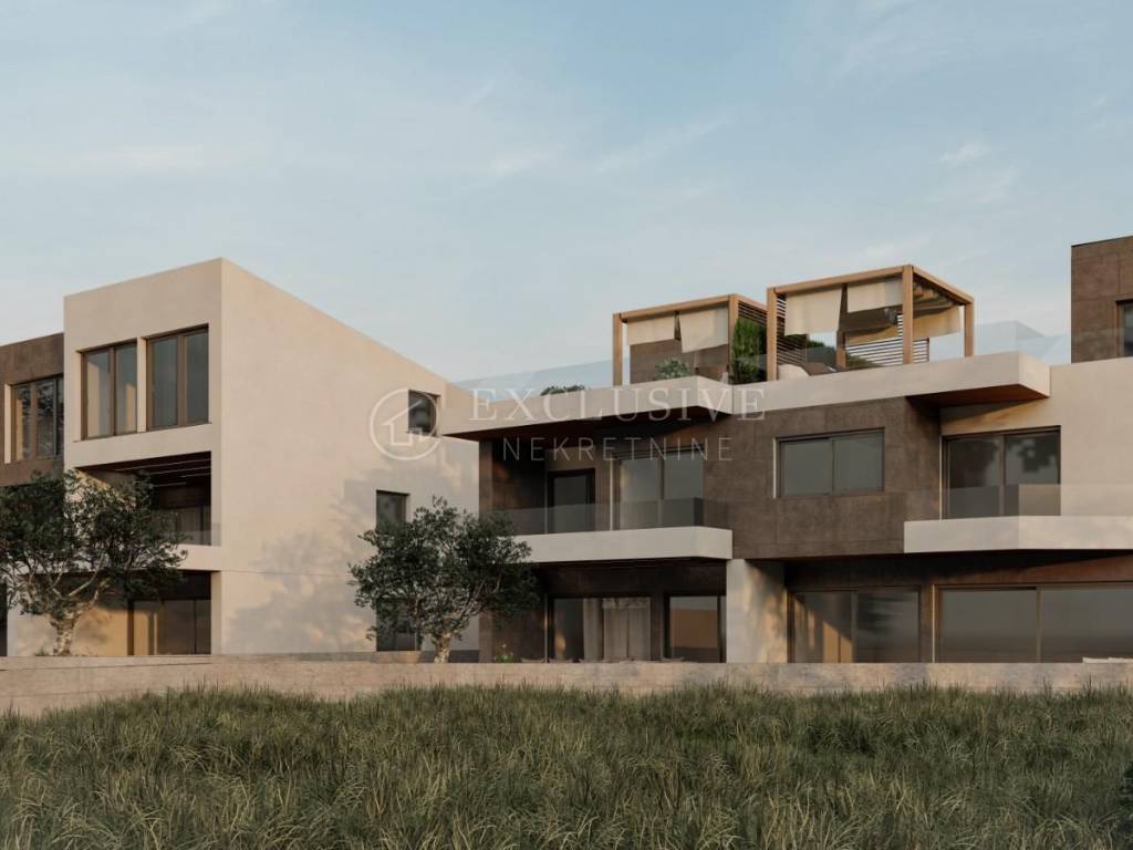 Zgrada 2 (Dvojna kuća): Broj stambenih jedinica: 2 Dvoetažni stanovi: 2 x cca 150 m², svaki s vrtom cca 200 m² Krovne terase: cca 100 m² po jedinici Parking: Svaka jedinica ima 3 parkirna mjesta Pogled: Otvoreni pogled na more Cijena projekta: 195,000€