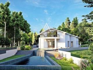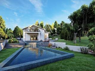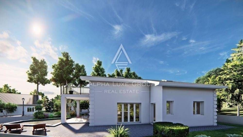 A corridor, staircase, bathroom, and bedroom complement the space on the first floor. The loft consists of three bedrooms with their bathrooms. The main bedroom has a wardrobe and a terrace with a sea view.
