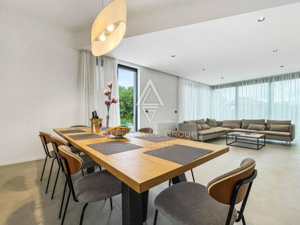 The villa has high-quality materials and a modern exterior and interior. It has underfloor heating, cooling air conditioners, solar panels, and a heated pool with a winter cover.