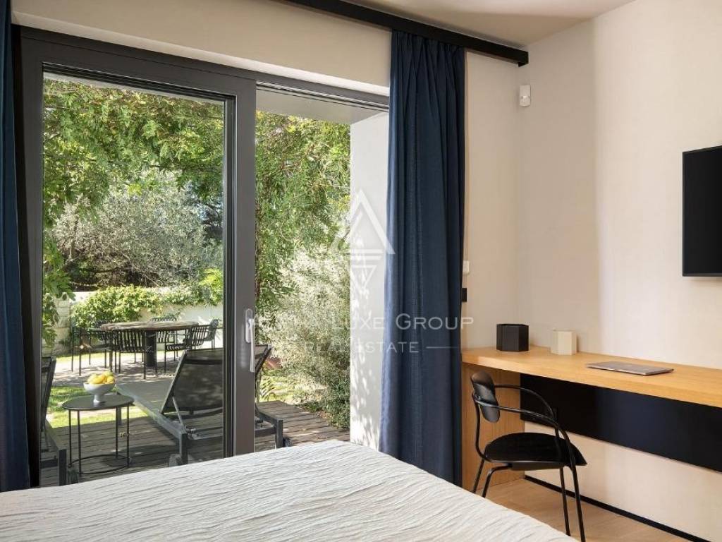 The ground floor boasts a private wellness retreat with a sauna, additional shower, and two spacious bedrooms with a shared bathroom. These rooms open onto a lush garden with a sun deck, creating a perfect space for relaxation. A curated wine cellar, stocked with top-quality Istrian wines, adds a touch of sophistication. The beautifully landscaped park, featuring olive and lemon trees, provides natural shade over a charming outdoor dining area.