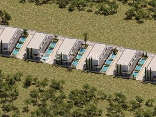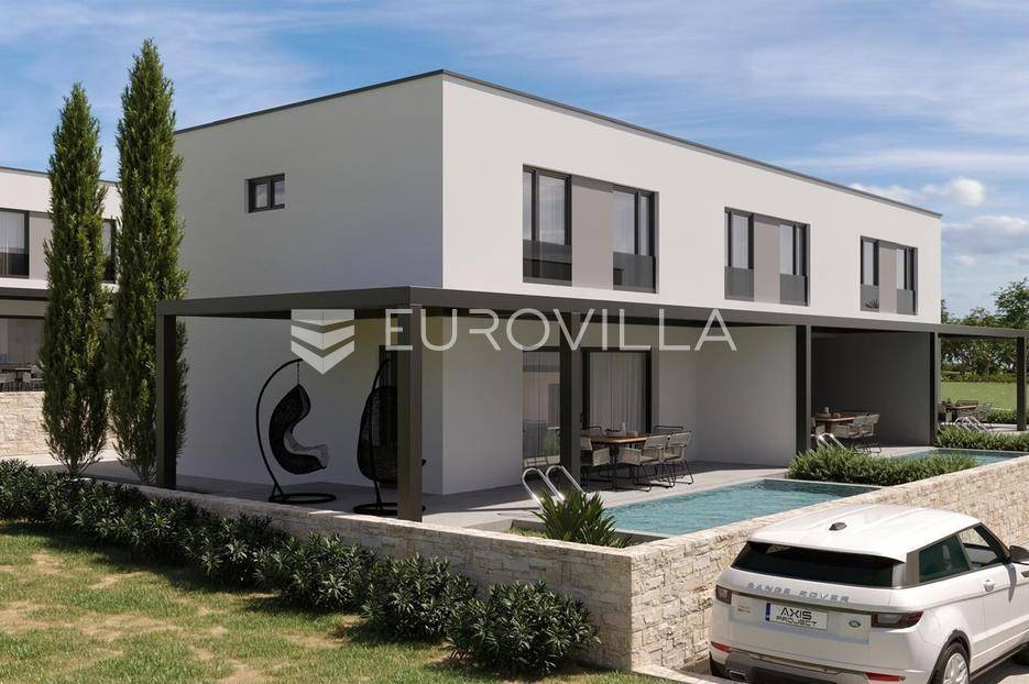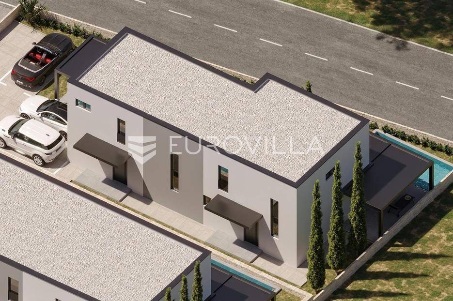 Mandre, u samom srcu najljepše ulice smjestio se stan S1 u trojnoj Vili 7- pažljivo projektiran dom s ukupno 87,60 m² zatvorenog stambenog prostora, raspoređenog kroz dvije etaže.Donja etaža prizemlja obuhvaća dnevni boravak, kuhinju i blagovaonicu otvorenog koncepta - 31.80 m², kupaonicu -5.10 m², hodnik - 3.20 m² i spremište - 3.40 m². Ukupno prizemlje: 43.50 m²Na katu se nalaze tri spavaće sobe - 10.90 m², 10.10 m², 8.50 m², dodatna kupaonica - 4.50 m² i hodnik sa stubištem - 10.10 m². Ukupno kat: 44.10 m²Stan krase francuski balkoni, koji omogućuju obilje prirodne svjetlosti i povezanost s vanjskim prostorom. Ugrađuje se dvobojna PVC stolarija dvobojna (antracit izvana bijela iznutra), aluminijske rolete s termoizolacijom, a u svakoj prostoriji predviđena je zasebna klima jedinica s funkcijom grijanja i hlađenja.Unutrašnjost prostora krase prvoklasne podne i zidne obloge, staklene tuš kabine te moderne sanitarije minimalističkog dizajna. Vanjski izgled odlikuje se suvremenim linijama i toplim detaljima poput kamenih zidova u dvorištu, zelenih površina i natkrivenih terasa.Cijeli kompleks zamišljen je kao funkcionalna cjelina s naglaskom na sigurnost, udobnost i estetiku - uključujući video nadzor, termo fasadu debljine 8 cm, široke pristupne staze i kvalitetno uređene popločane površine.Stan S1 nudi i impresivan privatni eksterijer:Bazen dimenzija 6×3 m (18 m²)Vlastito dvorište i sunčalište od 55 m²Dva privatna parkirna mjesta (ukupno 25 m²)Terasa za uživanje na otvorenomPovršina ukupnog vanjskog prostora iznosi oko 98 m², što u kombinaciji sa zatvorenim dijelom daje vrhunski životni ugođaj na 136,6 m2 u mirnom i zelenom ambijentu.Za dodatno više informacija stojimo na raspolaganju.