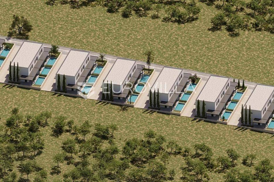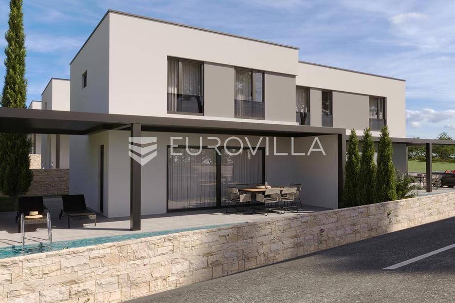 Mandre, u samom srcu najljepše ulice smjestio se stan S1 u trojnoj Vili 3- pažljivo projektiran dom s ukupno 87,60 m² zatvorenog stambenog prostora, raspoređenog kroz dvije etaže.Donja etaža prizemlja obuhvaća dnevni boravak, kuhinju i blagovaonicu otvorenog koncepta - 31.80 m², kupaonicu -5.10 m², hodnik - 3.20 m² i spremište - 3.40 m². Ukupno prizemlje: 43.50 m²Na katu se nalaze tri spavaće sobe - 10.90 m², 10.10 m², 8.50 m², dodatna kupaonica - 4.50 m² i hodnik sa stubištem - 10.10 m². Ukupno kat: 44.10 m²Stan krase francuski balkoni, koji omogućuju obilje prirodne svjetlosti i povezanost s vanjskim prostorom. Ugrađuje se dvobojna PVC stolarija dvobojna (antracit izvana bijela iznutra), aluminijske rolete s termoizolacijom, a u svakoj prostoriji predviđena je zasebna klima jedinica s funkcijom grijanja i hlađenja.Unutrašnjost prostora krase prvoklasne podne i zidne obloge, staklene tuš kabine te moderne sanitarije minimalističkog dizajna. Vanjski izgled odlikuje se suvremenim linijama i toplim detaljima poput kamenih zidova u dvorištu, zelenih površina i natkrivenih terasa.Cijeli kompleks zamišljen je kao funkcionalna cjelina s naglaskom na sigurnost, udobnost i estetiku - uključujući video nadzor, termo fasadu debljine 8 cm, široke pristupne staze i kvalitetno uređene popločane površine.Stan S1 nudi i impresivan privatni eksterijer:Bazen dimenzija 6×3 m (18 m²)Vlastito dvorište i sunčalište od 55 m²Dva privatna parkirna mjesta (ukupno 25 m²)Terasa za uživanje na otvorenomPovršina ukupnog vanjskog prostora iznosi oko 98 m², što u kombinaciji sa zatvorenim dijelom daje vrhunski životni ugođaj na 136,6 m2 u mirnom i zelenom ambijentu.Za dodatno više informacija stojimo na raspolaganju.