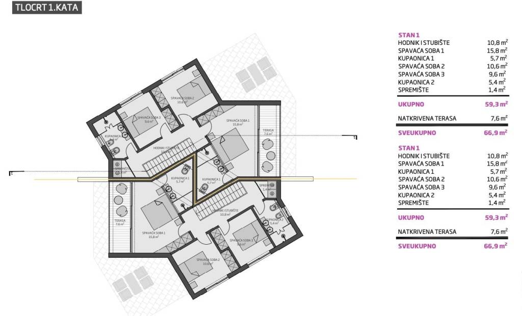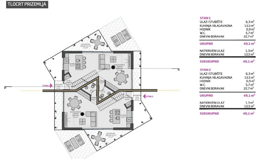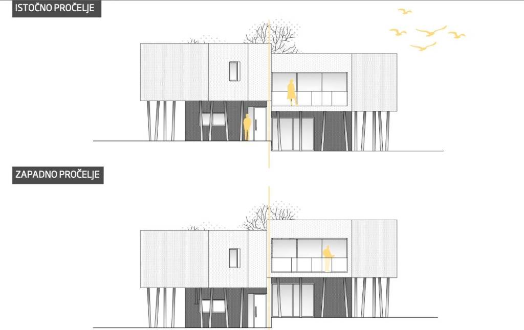 Each visually and technically modernly built villa consists of two residential units sold separately, with a total living area of 116 m2 each. Each unit consists of a ground floor and an upper floor with a flat roof.