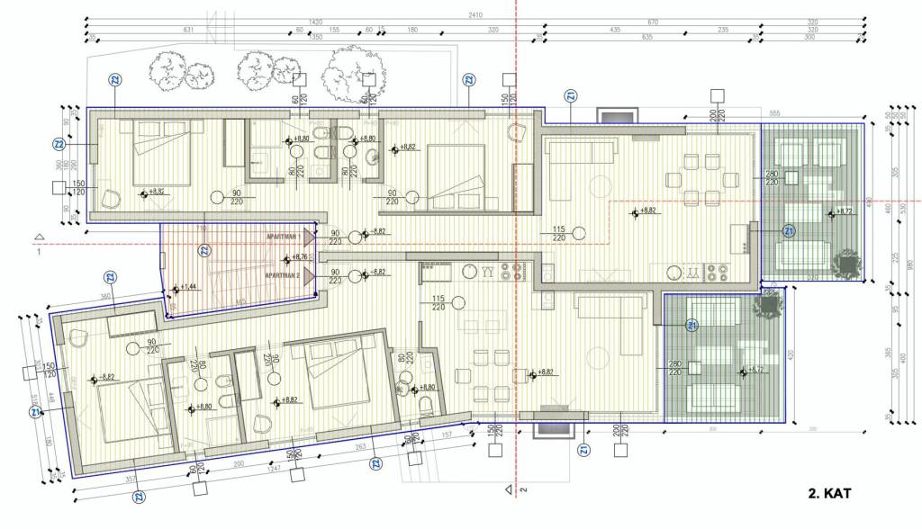 Apartment A1 is located on the 2nd floor of the villa and consists of: hallway, two bedrooms (13 m2), bathroom, toilet, living room, kitchen and dining room, covered terrace (13.50 m2) with sea view, of the outdoor parking space of this storage room in the basement, with a total net billing area of 87.48 m2. In the common yard of this urban villa, there is a summer kitchen with a gas grill for all co-owners, while in the basement there is a small fitness room.