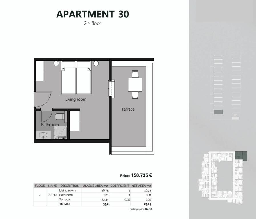 The interiors are finished with great attention to detail: bathrooms with kerok furniture resistant to water and impact, large-format ceramics, matte white sanitary ware with gold details, indirect lighting, designer interior doors and Diere security entrance doors. Apartments are equipped with a smart management system via app, while the entire complex is under video surveillance, ensuring safety and comfort.
