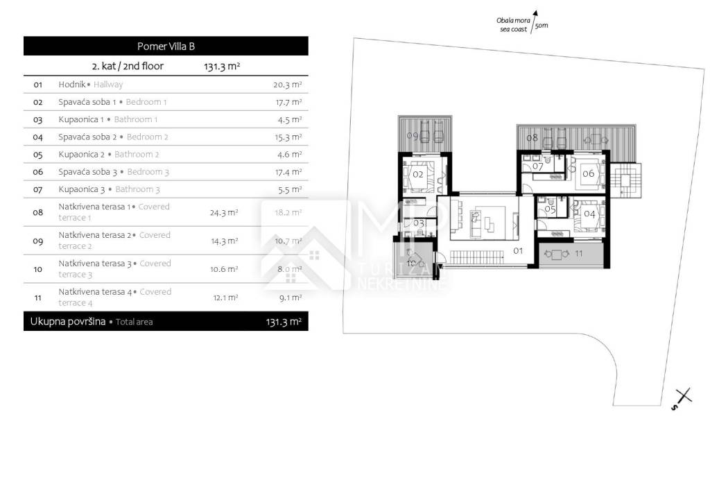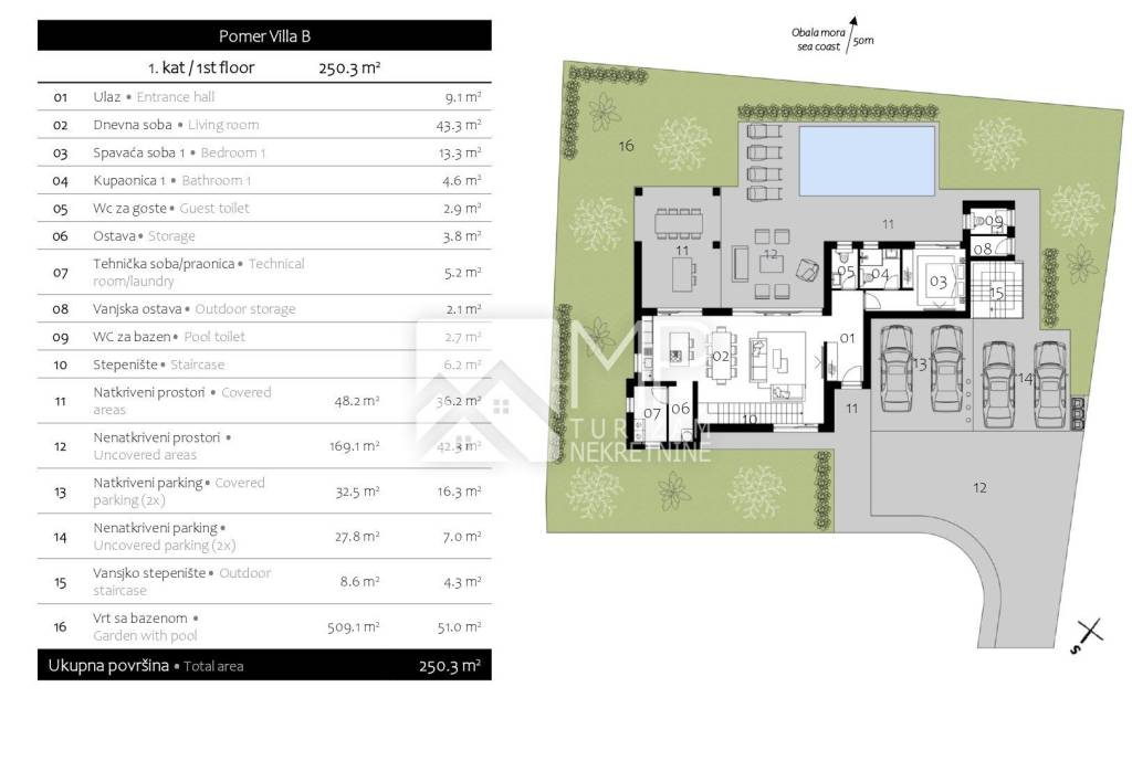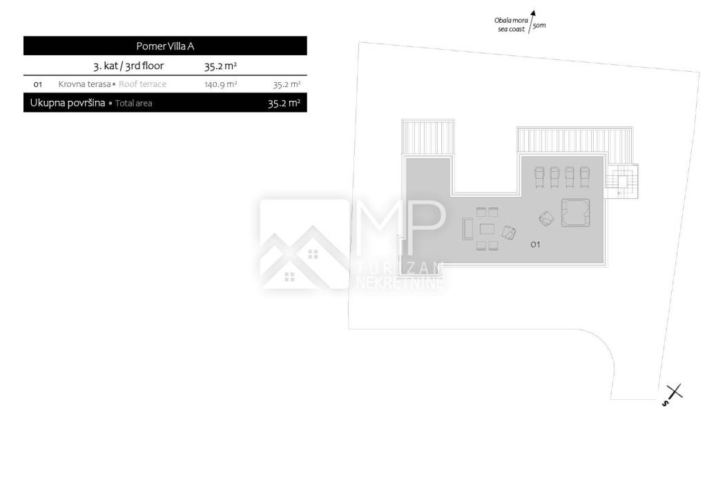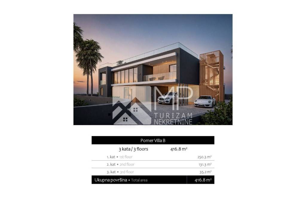 In an exceptional location in Pomer, just 50 meters from the sea, a modern and architecturally impressive detached villa with four spacious bedrooms, each with its own bathroom, plus two additional guest toilets, is for sale.
