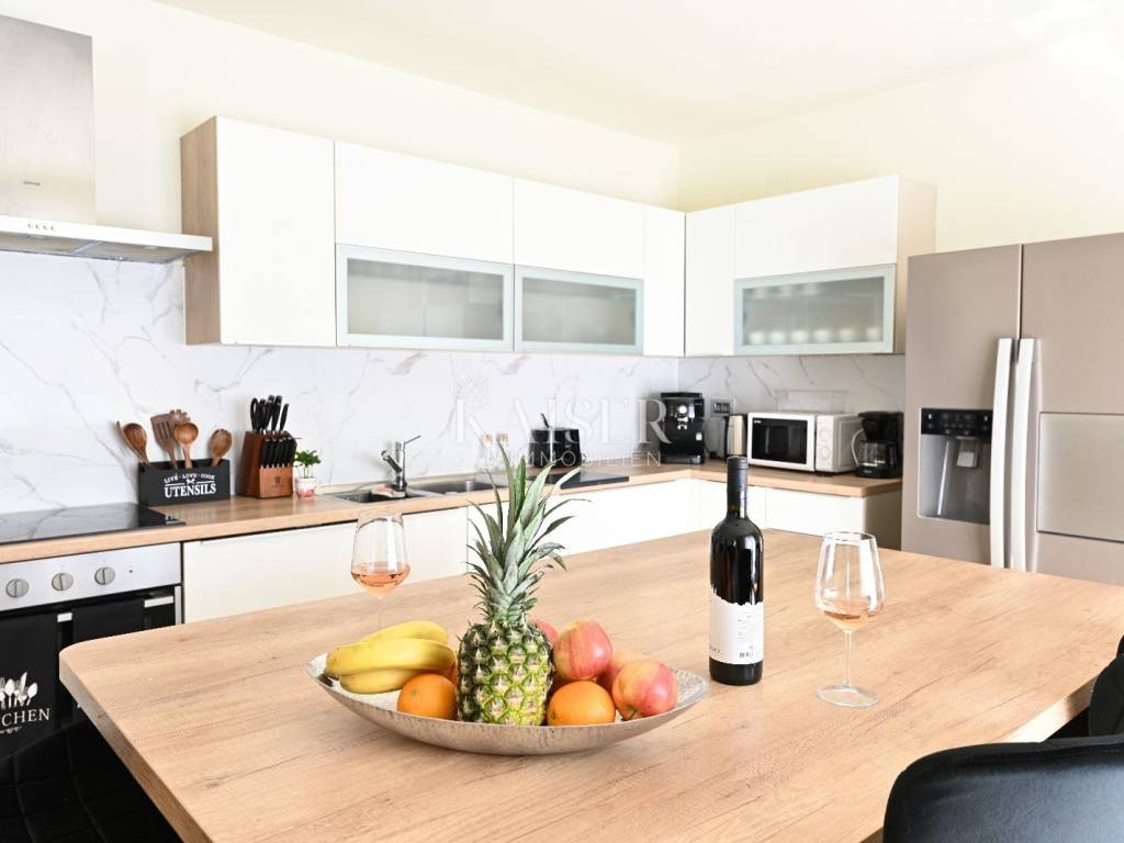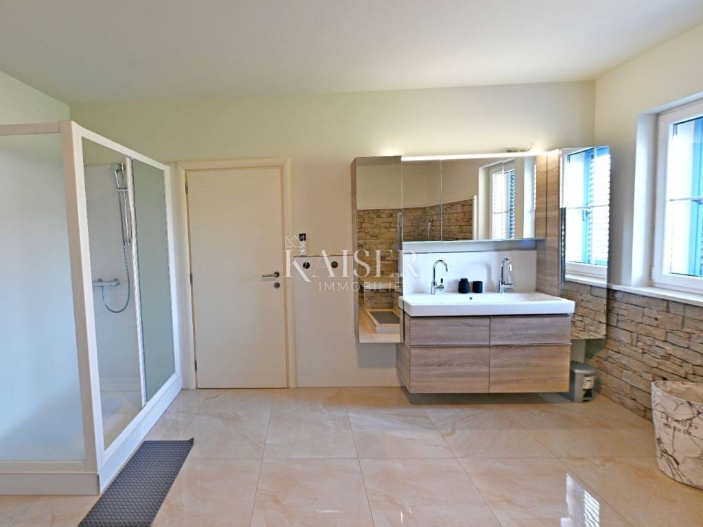 KAISER IMMOBILIEN presents you this time a beautiful villa with a large swimming pool in the town of Umag. Umag is a picturesque town in the northwest of Istria, located on the Adriatic coast, known for its rich history, Mediterranean atmosphere and developed tourism. The old town core with narrow stone streets and walls bears witness to the Roman and Venetian heritage, while modern Umag offers well-maintained beaches, promenades and sports facilities. The town is particularly recognizable for the ATP Croatia Open tennis tournament, which attracts visitors from all over the world every year, and the combination of sea, culture and gastronomy makes Umag an attractive place to relax and live. This beautiful holiday villa is located in a quiet and secluded location, far from the hustle and bustle of the city, in an exceptionally beautiful position that provides complete privacy and relaxation. It is surrounded by a very large garden, enriched with centuries-old olive trees that create a special Mediterranean atmosphere and a sense of connection with nature. The villa is built in an authentic Istrian style, with carefully preserved traditional elements such as stone and warm natural materials, which are harmoniously complemented by details of modern architecture. The combination of indigenous Istrian motifs and contemporary design results in an elegant, comfortable and functional space, ideal for a peaceful and luxurious holiday in the heart of Istria. The villa has been designed with special attention to comfort, functionality and a sense of spaciousness. Entering the hall opens the way to an exceptionally large and bright living room, designed in a modern *open space* style, in which the living area, elegant dining room and fully equipped kitchen are harmoniously connected. This layout creates an ideal environment for socializing, relaxing and sharing moments in a pleasant atmosphere. The villa has five separate bedrooms, each of identical size, which ensures the same level of comfort for all guests. There are also two modern bathrooms, as well as an additional, separate toilet. A special room is intended for sports and recreation and is decorated as a fitness room, allowing for active stay in the privacy of your own space. For a pleasant temperature throughout the year, the villa has a heating and cooling system via air conditioning, as well as a heat pump connected to underfloor heating, which guarantees a superior level of comfort in all seasons. The outdoor area is a true little Mediterranean paradise. The spacious garden is surrounded by an olive grove that provides natural shade and a sense of peace, while the large 6 x 8 meter swimming pool invites you to refresh and enjoy the warm summer days. The large terrace offers enough space for outdoor activities, relaxing in the shade with a glass of cold drink, sunbathing or evening gatherings. There is a special area for barbecues and relaxing in comfortable armchairs, making this villa the perfect place for a carefree and luxurious vacation in the Istrian environment.