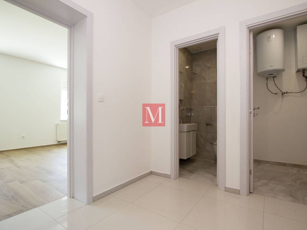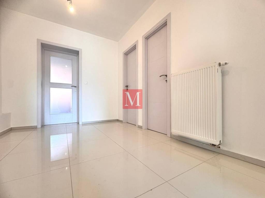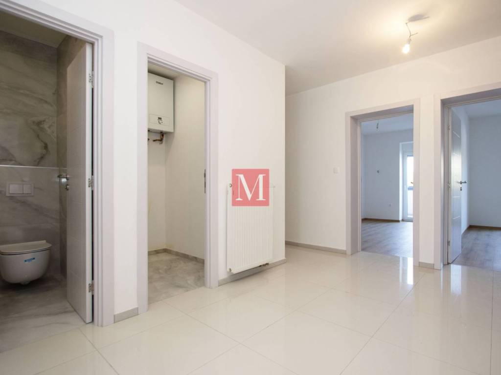 It consists of an entrance hall, open space kitchen with dining room and living room, utility room, guest toilet, three bedrooms, two bathrooms and a terrace (12.76 m2). The apartment has a garage (11.50 m2), and a storage room (9.87 m2) in the basement of the building.