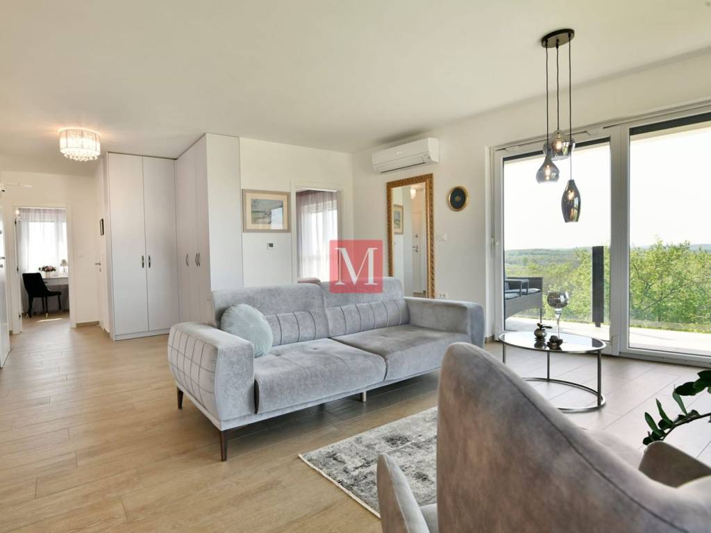 Elegant and bright 3 bedroom apartment with sea views on the 2nd floor of a newer building, in the quiet village of Žbandaj, just a few minutes' drive from Poreč and the sea.