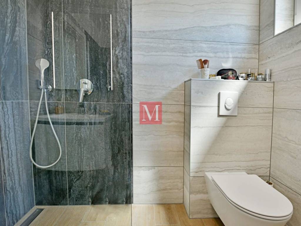 It consists of an entrance hall, a pleasant open-space living room with dining room and a modernly equipped kitchen in a classic style, three spacious bedrooms, two bathrooms, an additional toilet and a practical storage room, and a special atmosphere is provided by a covered terrace overlooking the greenery.