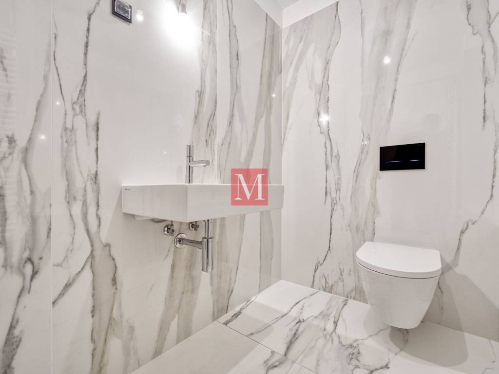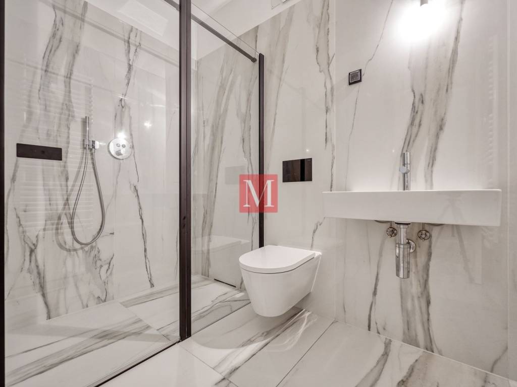 Bathroom equipment from renowned manufacturers (Kerrock, Laufen, Huppe, Axor) with high-quality faucets, bathtubs, walk-in shower with a partition made of lamistal transparent glass and wall-mounted shower channels, toilets and cantilever bidets with soft close lowering of the board. Geberit built-in cisterns are installed in all sanitary units, which are characterized by silence, hygiene and long-term reliability, with a sensor button for two-volume flushing as the only visible element, and with a special odor drain from the toilet bowl.