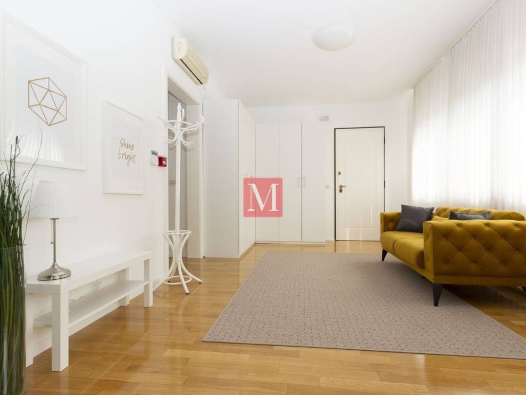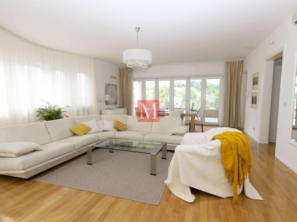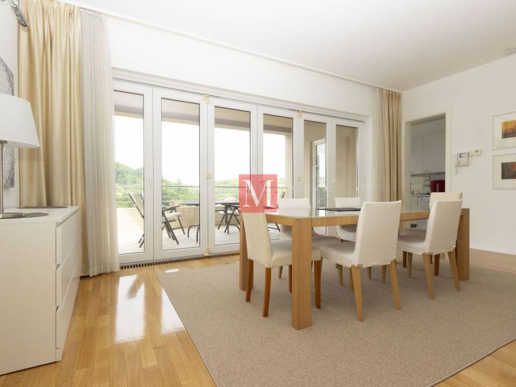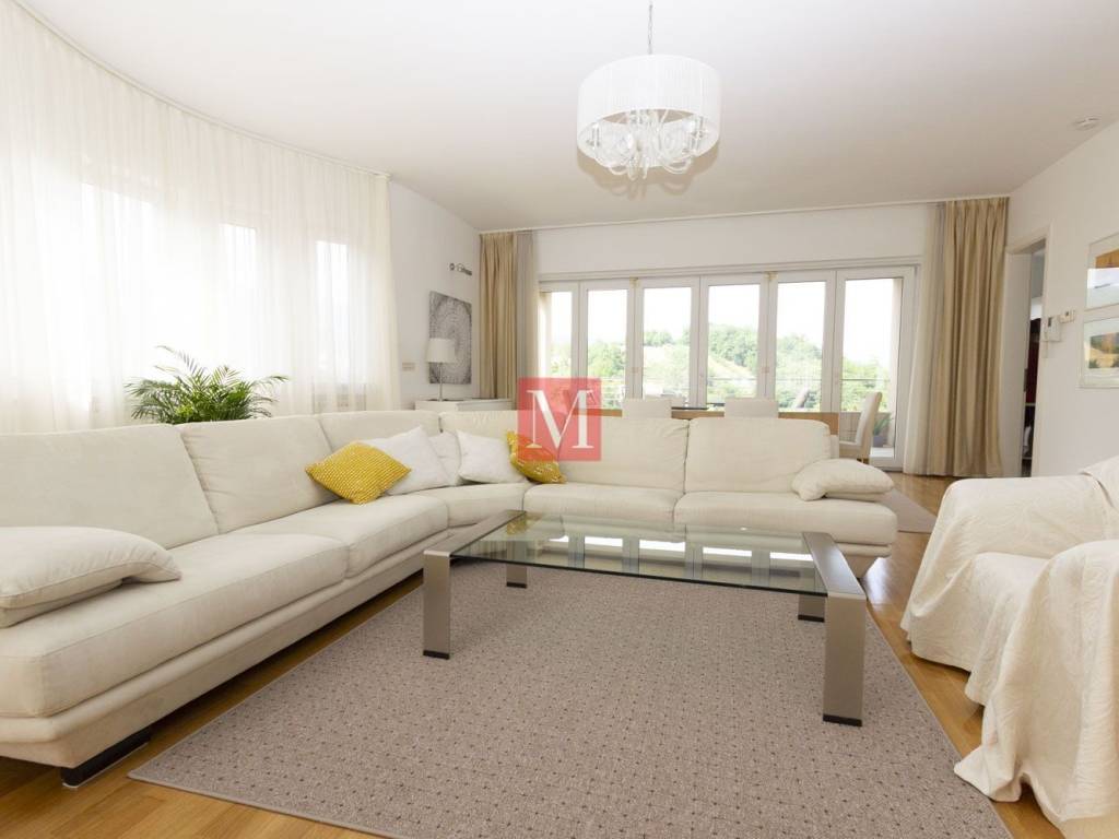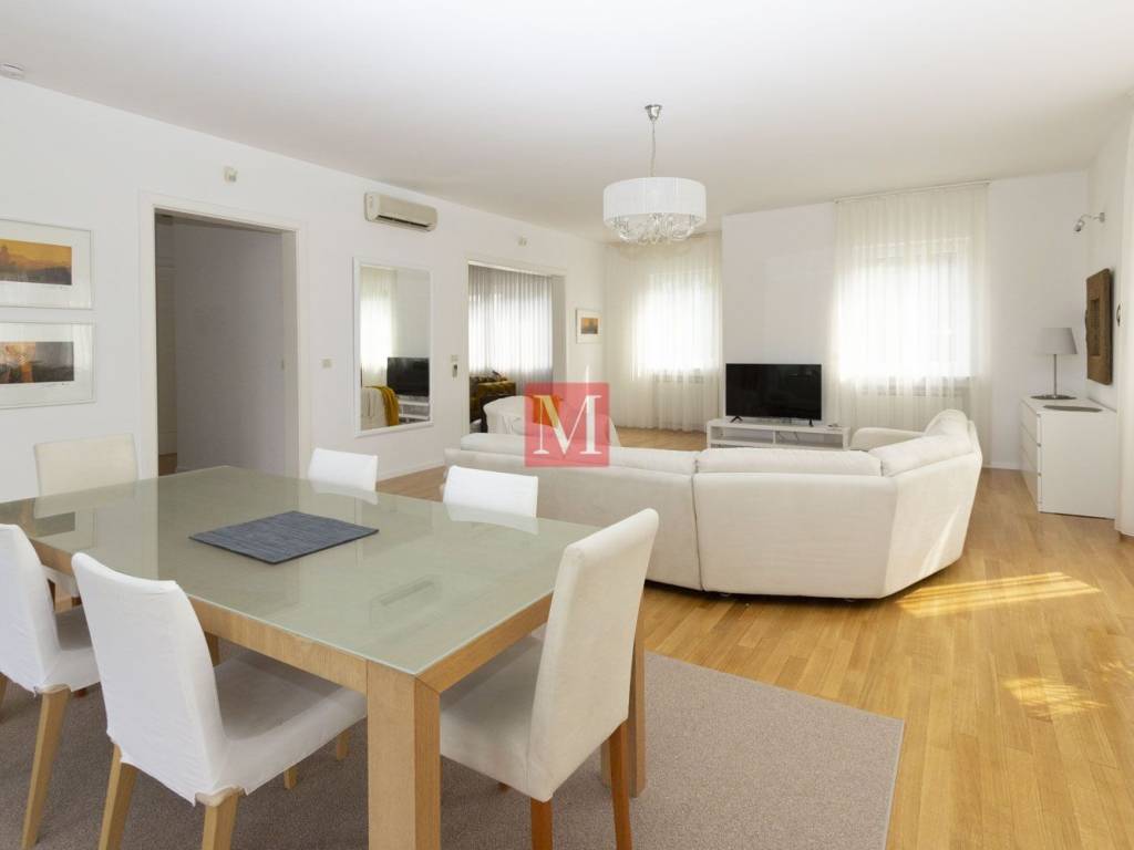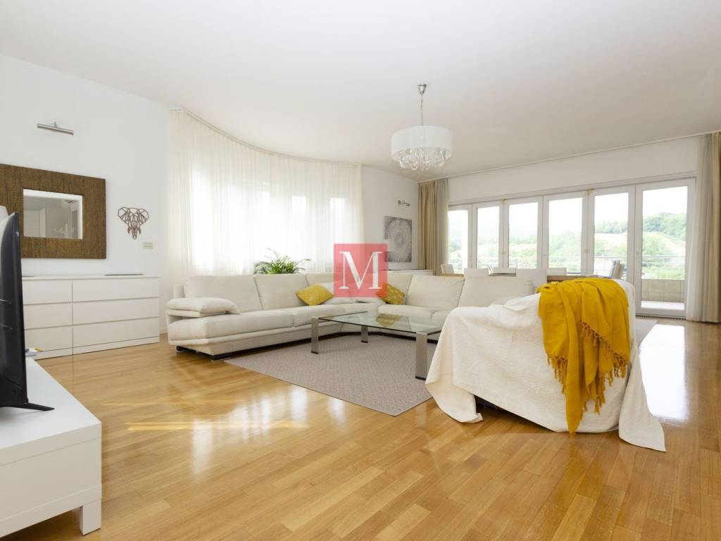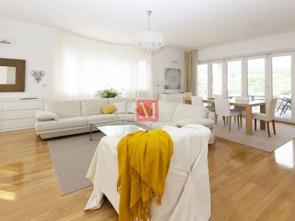 Beautiful apartment of 160m2 in an excellent newer urban villa in peaceful and green surroundings of Mlinovi. It consists of a living room with dining area and exit to the terrace, a kitchen, 2 bathrooms, guest toilet, utility room, 3 bedrooms and 2 terraces . The apartment has an alarm and security doors , air-conditioned rooms, Internet and it comes with a garage for 2 cars. Agency fee: 1 monthly rent + VAT.