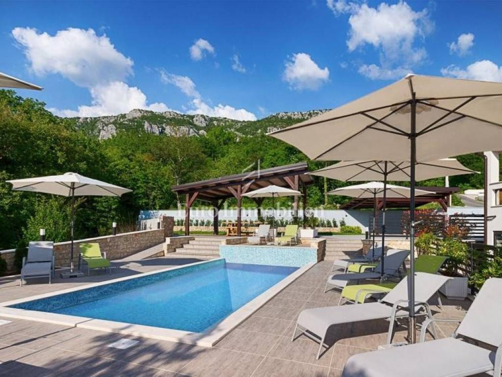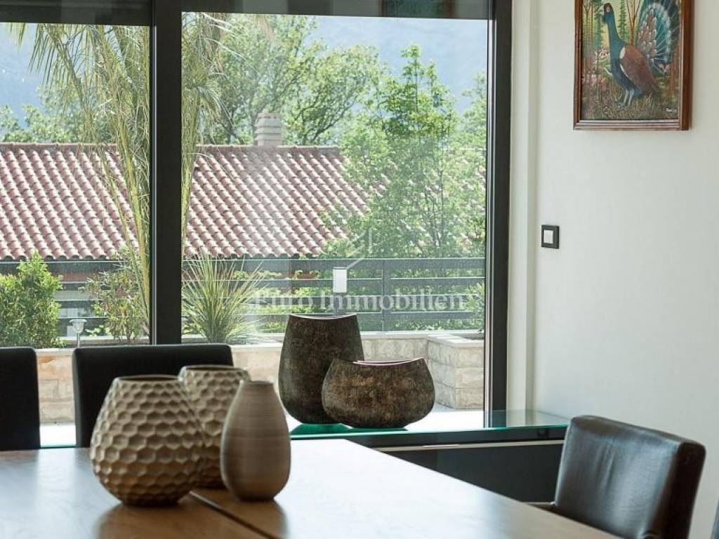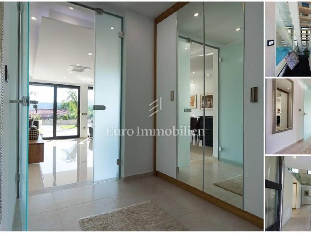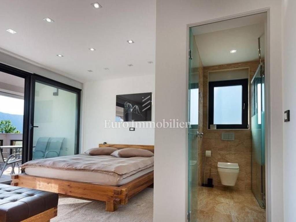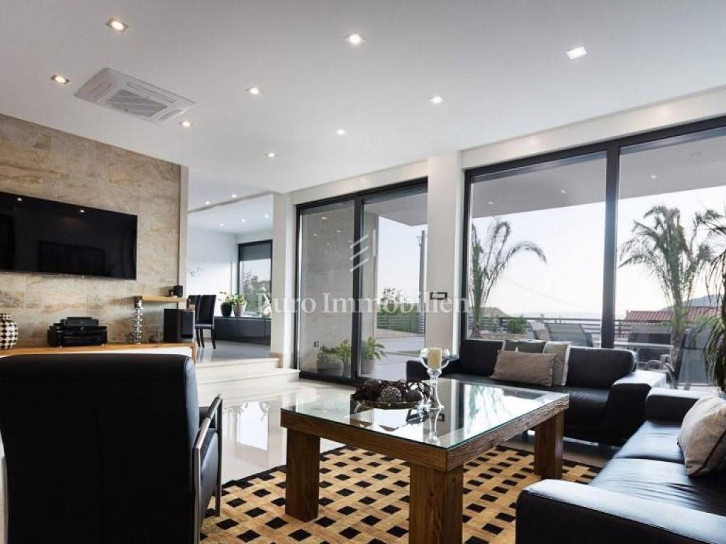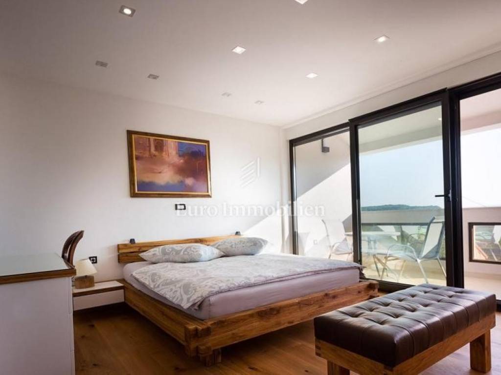 Beautiful modern vila on a quiet location. Characterized by its unique design, this contemporary villa offers unparalleled style and functionality. Villa extends to 350 sqm and it consists of a groundfloor, first and second floor. Three bedrooms with private bathrooms occupies the first floor, while on the second floor there is a one-bedroom apartment. Spacious living room and top quality equipped kitchen with dining area area on the groundfloor with a indoor swimming pool and sauna.