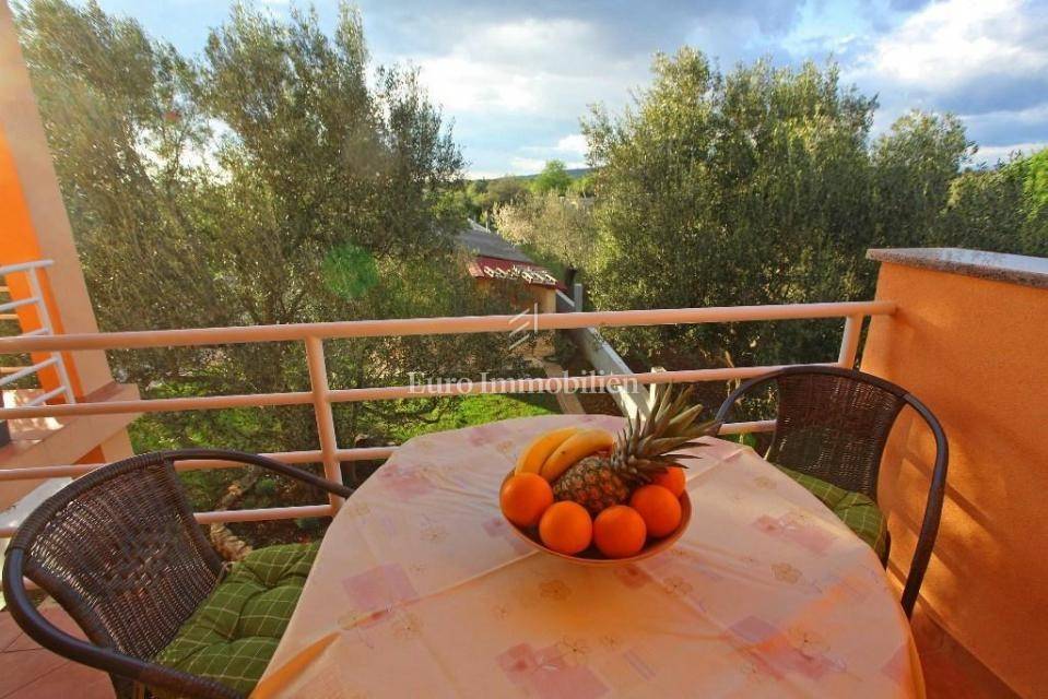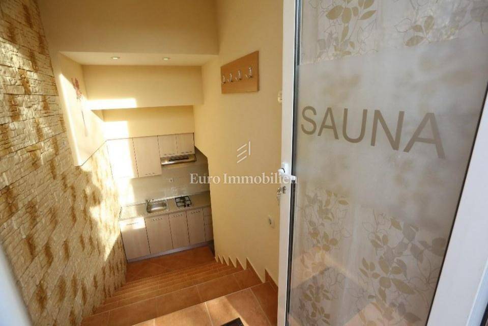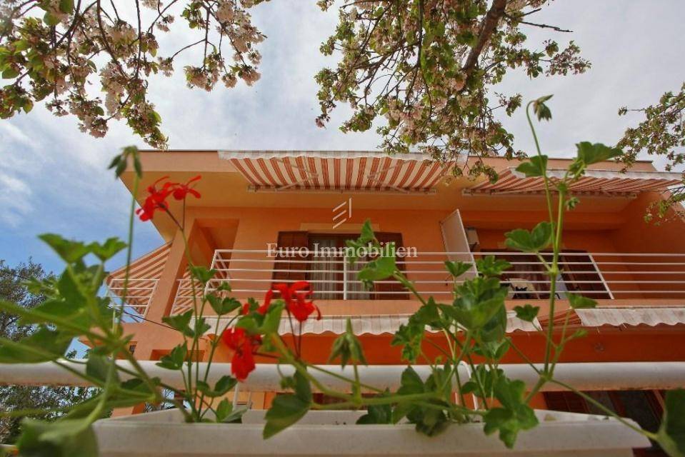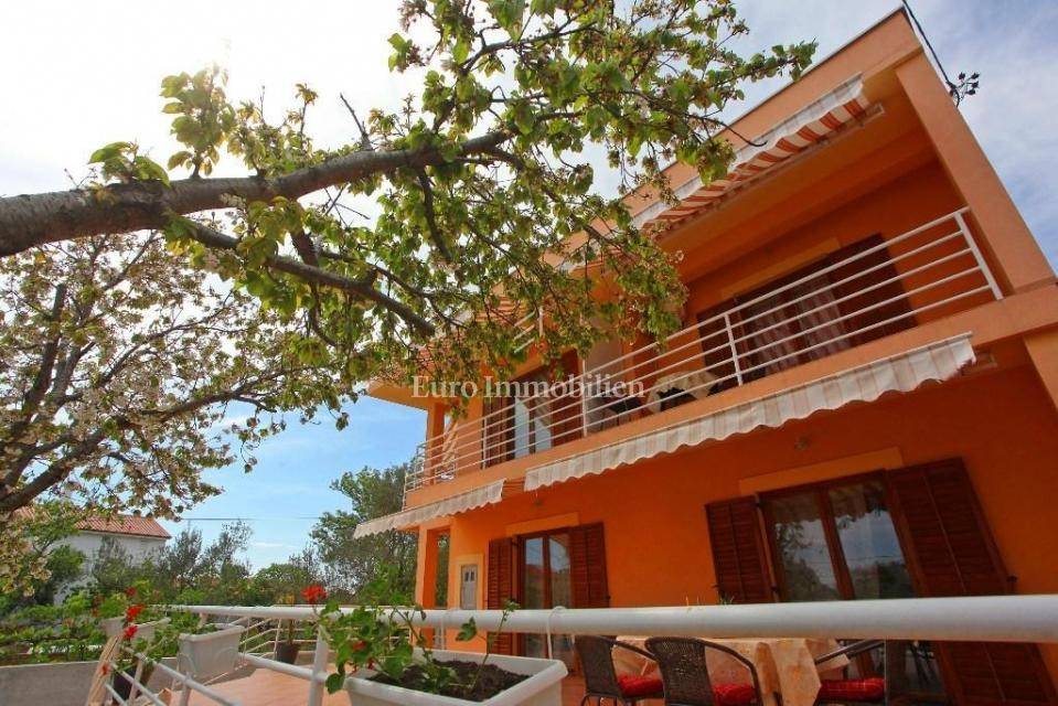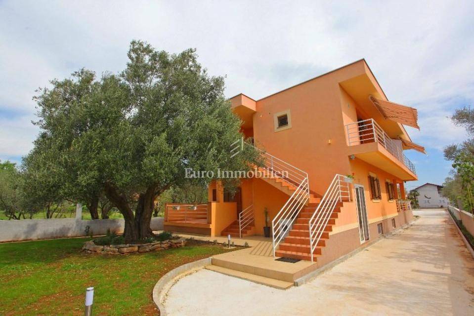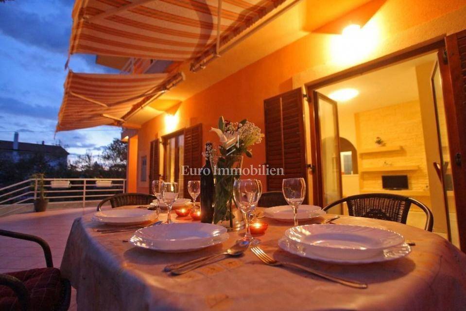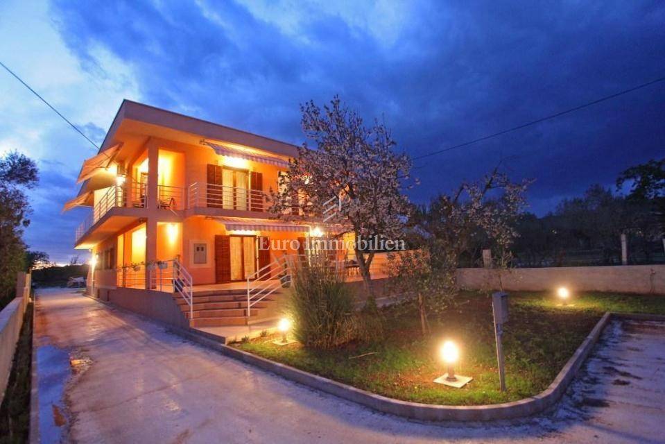 In a quiet location in Sukošan, an apartment house is for sale, built on land of 1952 sqn. The house has a residential area of 398 sqm and consists of basement, ground floor and first floor. In the basement there is an apartment with one bedroom and a sauna.