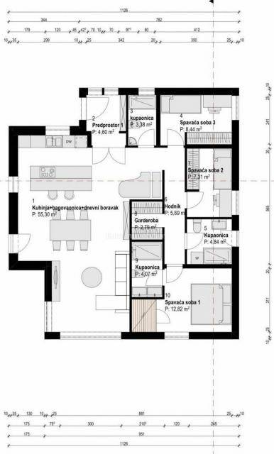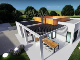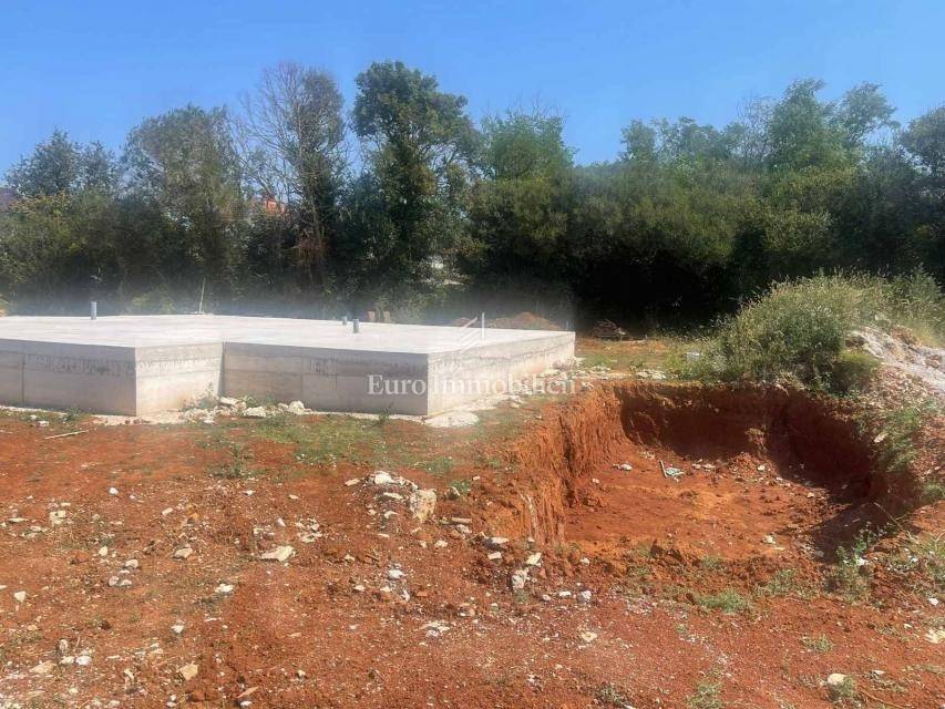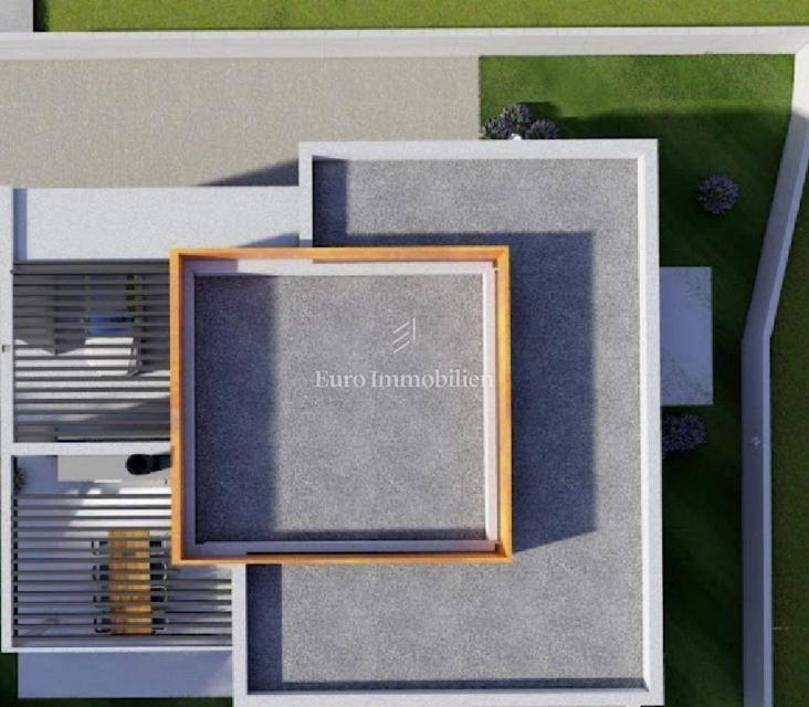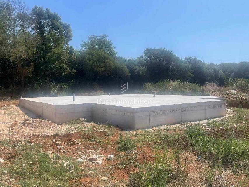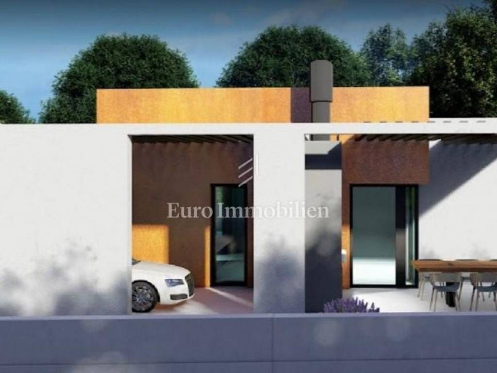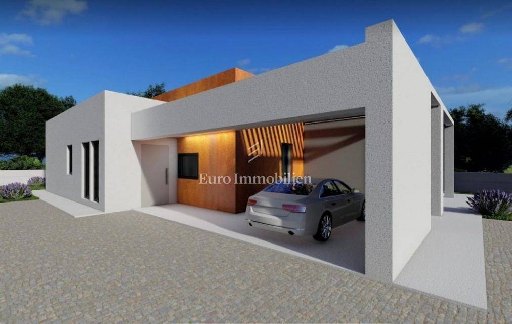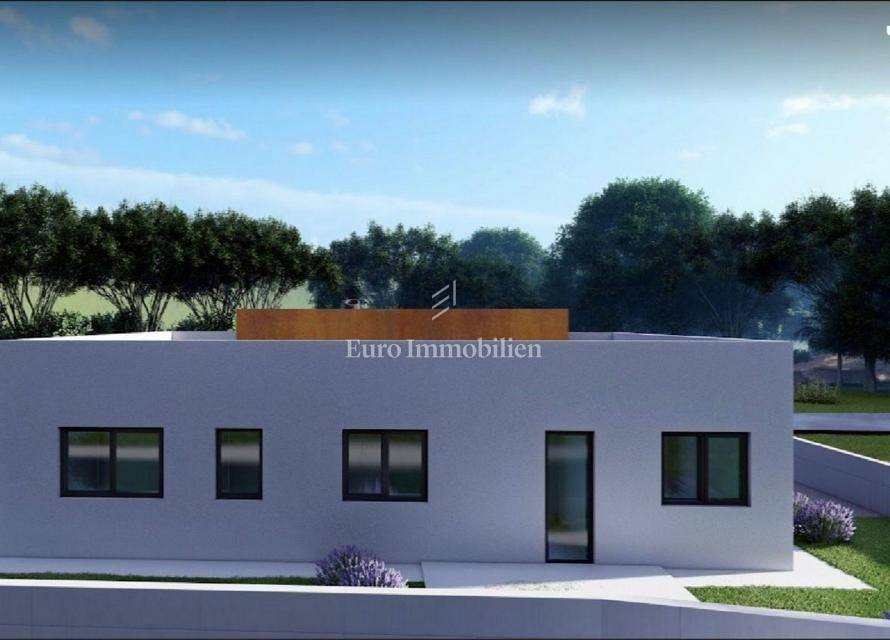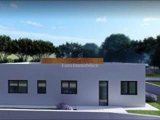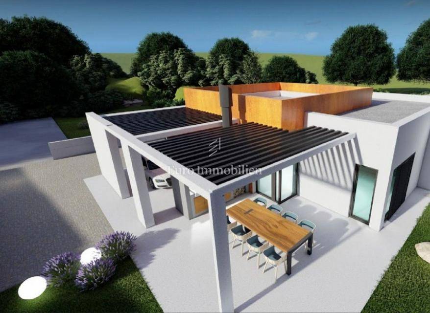 This beautiful modern beauty is being built in the immediate vicinity of Pula, surrounded by olive groves and nature. The 135 m2 floor plan will accommodate: an entrance area, three rooms, a hallway, three bathrooms, a wardrobe, a kitchen and a living room with access to a semi-covered terrace. The house will also have a covered parking space for one vehicle.