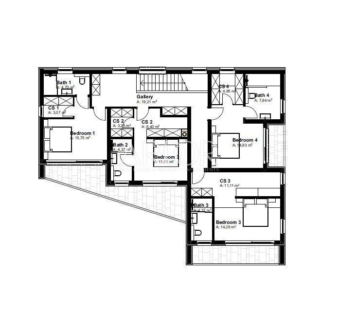 The interior area of ​​335 m2, spreads over three floors and consists of 4 bedrooms, all with private bathrooms and walk-in closets, a living room with kitchen and dining room, a wellness room with sauna and jacuzzi and a spacious terrace with an infinity pool of 50 m2.