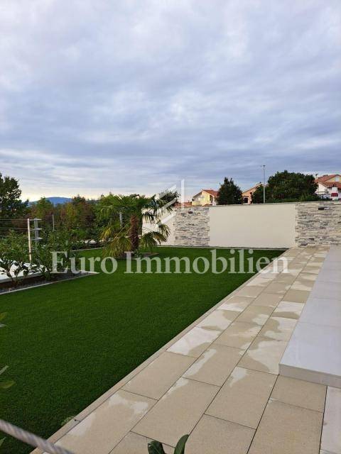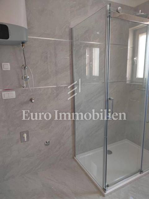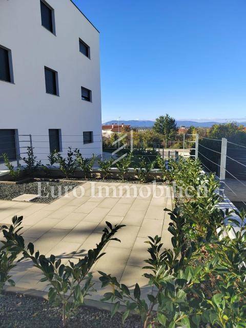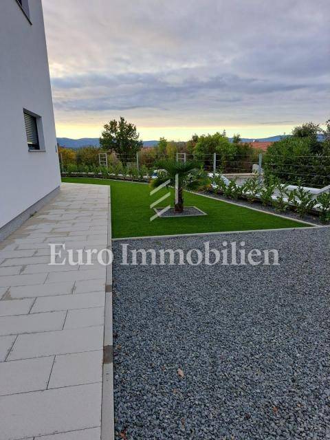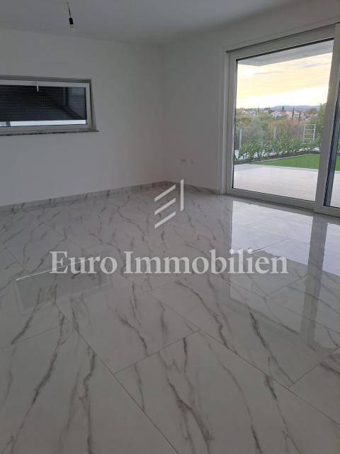 The apartment is located on the first floor. The living area is 72m2 and consists of an entrance area, living room, kitchen and dining room, bathroom, two bedrooms, and exit to a covered terrace with a beautiful view of the sea. The apartment has a space on the ground floor, with the same square footage and layout. The property also includes a 125m2 garden and two parking spaces. The highest quality materials were used in the construction, such as ceramic floor coverings, glass walls, and PVC joinery. The move-in is scheduled for February 2023.