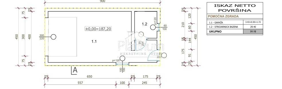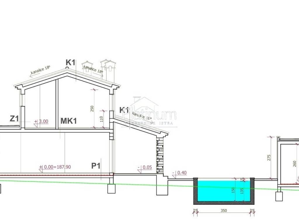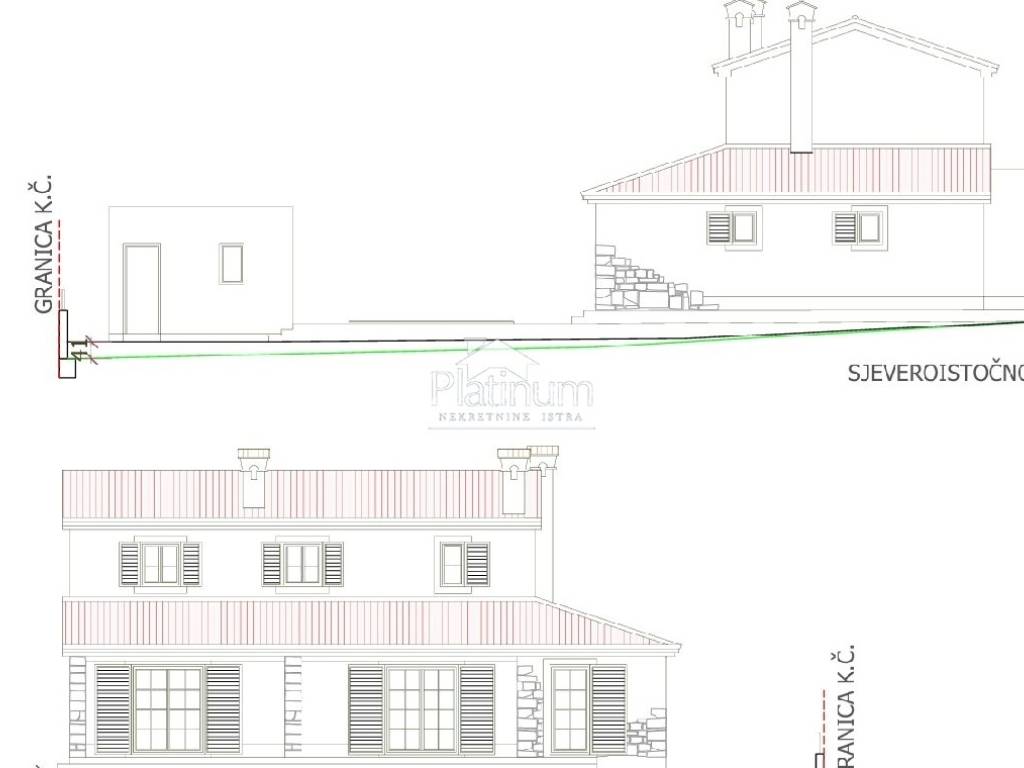 U mirnom dijelu Krnice, prodaje se ovo građevinsko zemljište s projektom i građevinskom dozvolom. Kuća prema projektu sastoji se vod prizemlja i kata ukupne netto površine 159,44m2 koja se sastoji od tri spavaće sobe, tri kupatila, wc-a, kuhinje, balkona, spremišta, natkrivene terase, pomoćne zgrade i strojarnice 31,12m2 te bazena od 35m2.