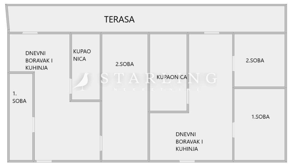 Each unit consists of two bedrooms, a living room with a kitchen and dining area, and a balcony.