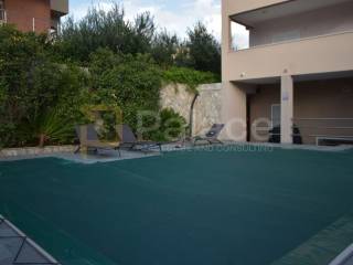 The apartment includes a terrace with an outdoor kitchen and a spacious yard with a pool and a cellar.