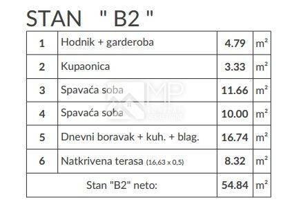 The apartment stands out with its functional and well-designed layout, providing comfort and privacy in two bedrooms, which is rare in a new building of this size. Large glass elements allow for plenty of natural light, and the living room has direct access to a spacious covered terrace, ideal for relaxing and socializing. The price includes a parking space, and buyers are exempt from paying real estate tax.