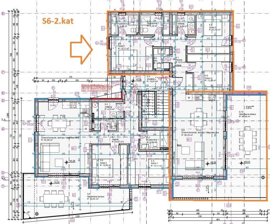 Apartment S6 - three-room apartment on the second floor of a residential building with a net area of 132 m/2. The apartment consists of an entrance hall, three bedrooms, one of which is a master bedroom with its own bathroom, a shared bathroom, laundry room, toilet, and a large living room with access to a covered terrace of 46.05 m/2. The apartment has two parking spaces.