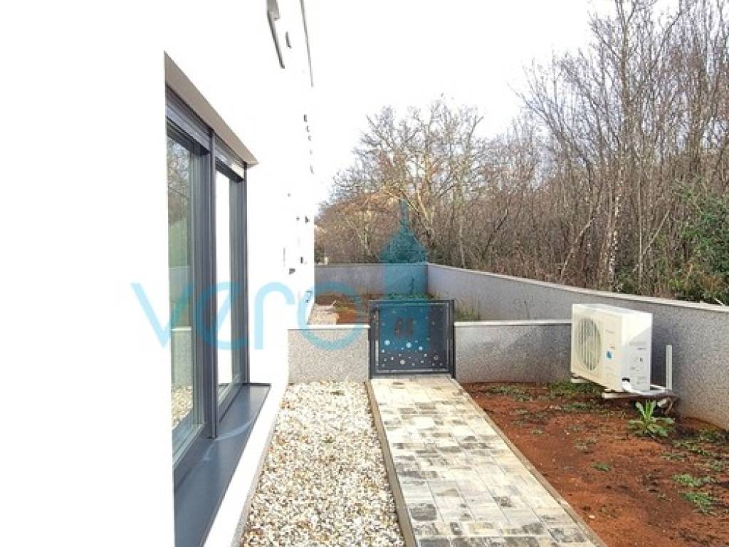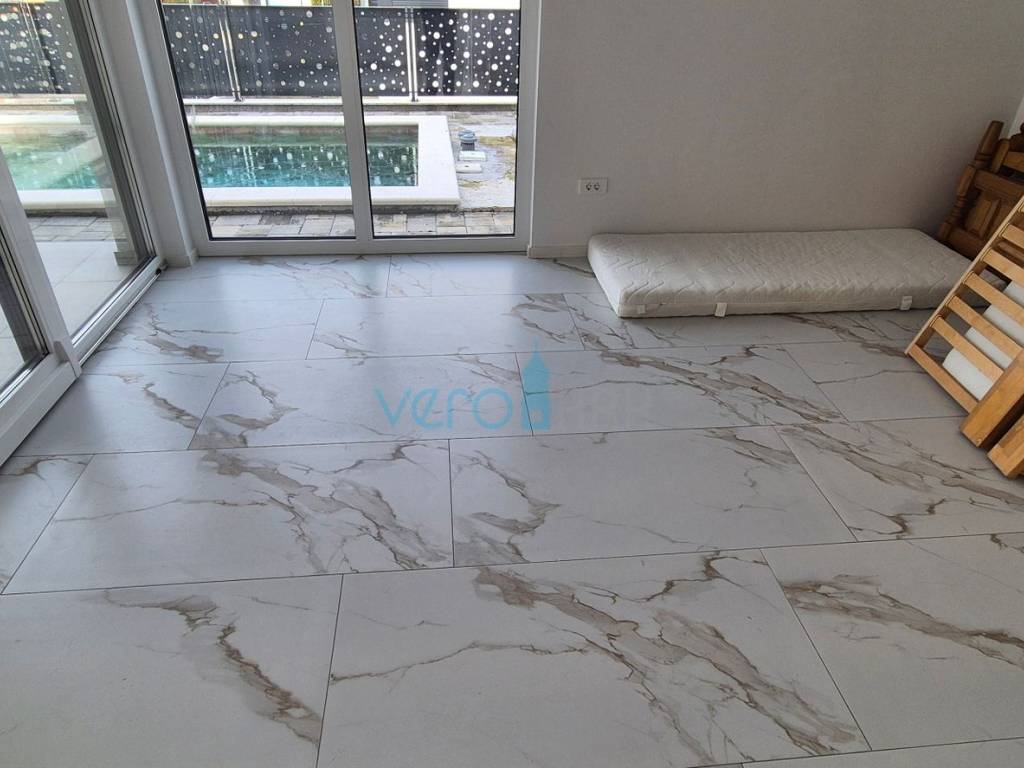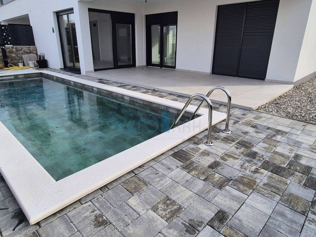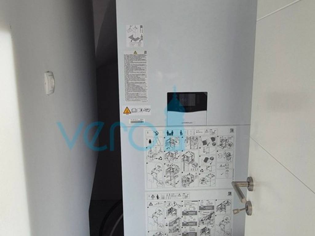 The house is equipped with high-quality triple-glazed PVC joinery, parquet flooring in the bedrooms, electric shutters with remote control and mosquito nets, security doors, ceramic floor coverings, underfloor heating via a Vaillant heat pump system, and additional Bosch air conditioning in all rooms.