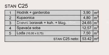 Apartment C25, with an area of ​​53.42 m2, is located in building C.The apartment is located on the 3rd floor of the building and consists of a hallway with a wardrobe, a living room with a kitchen and a dining room, a bedroom, a bathroom and a loggia.The apartments are sold on a turnkey basis with a fully equipped bathroom (furniture and sanitary ware), flooring in all rooms (1st class ceramics, laminate), with electrical installations, built-in air conditioning, interior joinery, exterior PVC or ALU joinery, burglar-proof and fire-resistant entrance doors, an antenna system, a UTP network, and white walls and ceilings.A garage space and a storage room of 3.2 m2 can be purchased with the apartment, which are charged additionally.The price of the garage space is 35,000 euros.Note: VAT is included in the price.For further information, please contact:Azra+385 91 6115706+385 98 420885azra@almadominvest.com