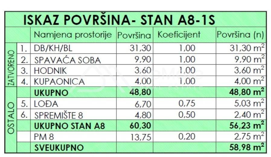 The internal living area is 48.80 m2, and the total calculated useful value of the area of the apartment with its belongings is 58.98 m2.