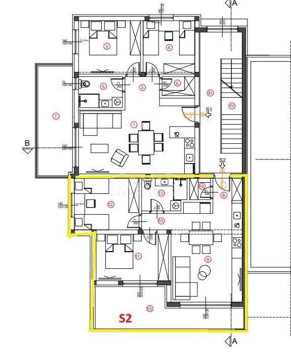 Residential unit S2 is located on the first floor of the building and has a usable area of 71.70 m². The apartment consists of a spacious open-plan kitchen, dining area, and living room with access to a covered loggia of 14.04 m², as well as two bedrooms, one of which also has direct access to the loggia, one bathroom, and a storage room. The apartment includes two parking spaces. The property is southwest-facing.