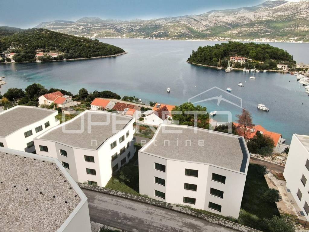 A spacious luxury apartment on Korčula with a breathtaking sea view offers a unique opportunity to enjoy modern design and top-notch comfort in one of the most desirable locations on the Adriatic. Situated in a prestigious complex in the second row from the sea, the apartment spans 67.69 m² of living space, complemented by a 15.71 m² terrace and a 12.50 m² garage parking spot. With a total net usable area of 77.87 m², the apartment is perfectly designed for comfortable and luxurious living.
