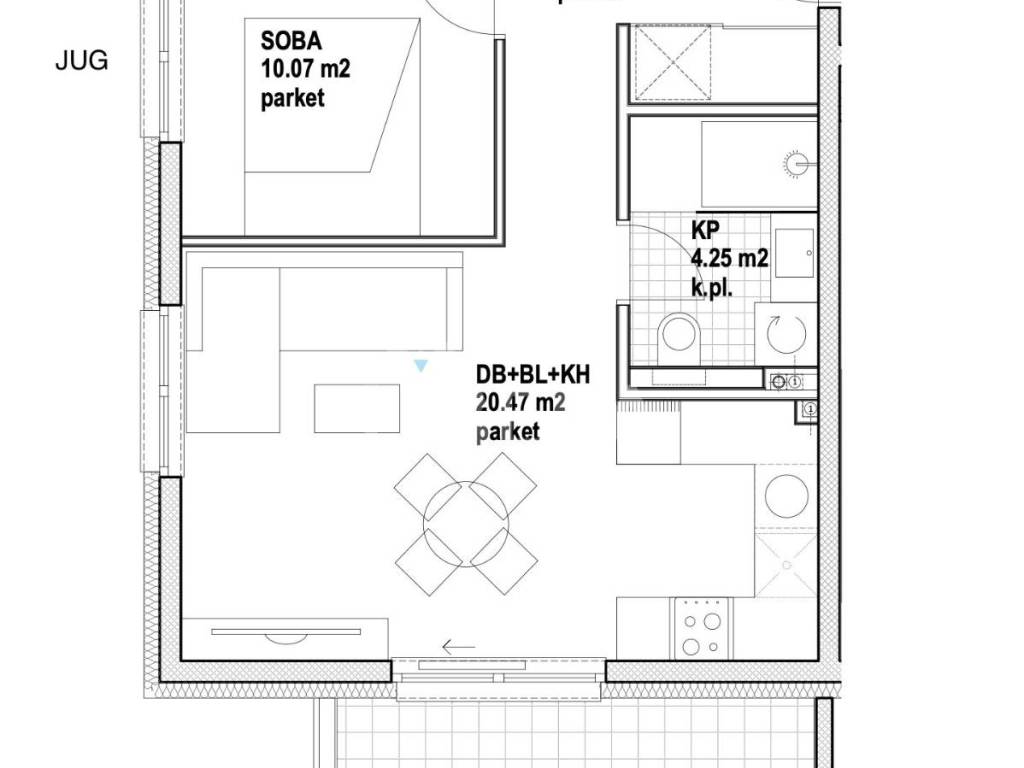 Stan se sastoji od dnevnog boravka s kuhinjom i blagovaonicom, spavaće sobe, kupaonice s wc-om, ulaznog hodnika, balkona i spremišta.